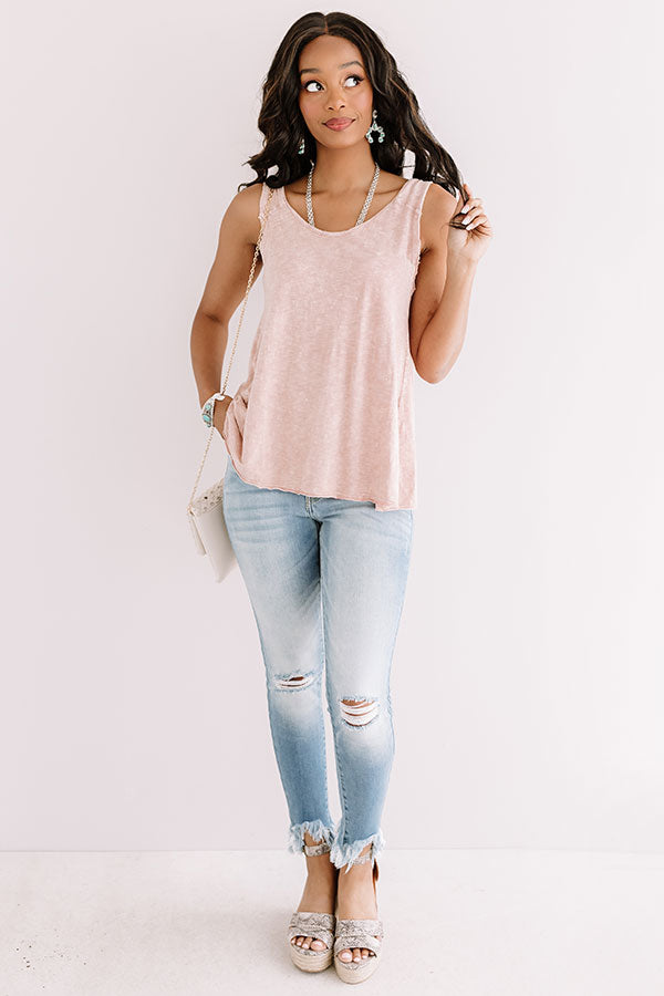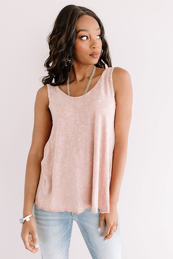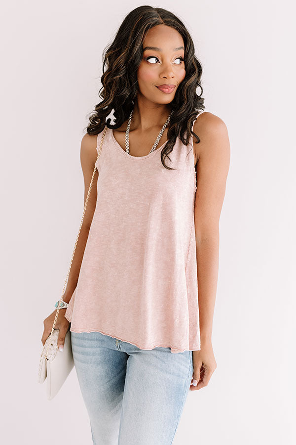 Keep your style carefree in this flirty blush colored top featuring lightweight breezy material, a scooped neckline, wide 2-inch sleeveless shoulder straps, a low open v-cut back with a twisted detail, and a relaxed silhouette that falls into an uneven hemline! We have styled this unique piece with some frayed light wash skinnies, snake print block heels, and a neutral crossbody, but you can also wear it with some white shorts, "The Underwood Faux Leather Wedge in Blush," and our "Plans In Paris Wool Hat in Cream!" Measurements