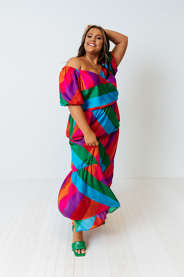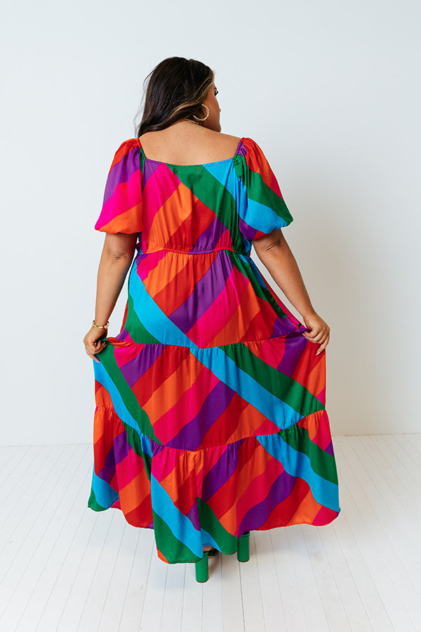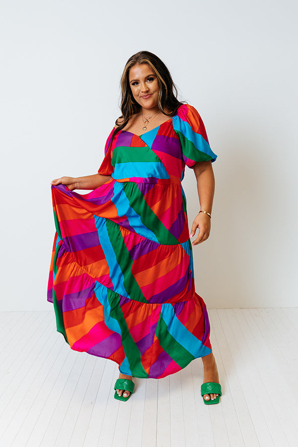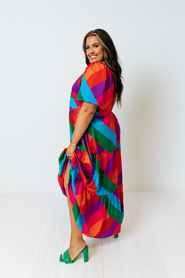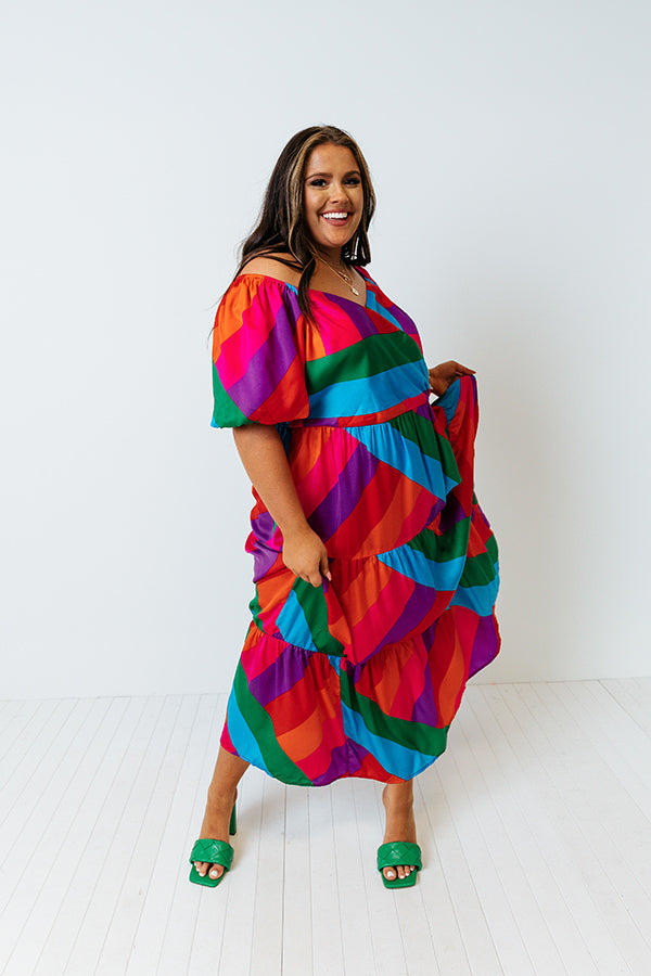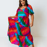 Live your life boldly in our stunning plus size 'Caribbean Sea Maxi' dress featuring lightweight breezy material patterned with a red, purple, green, and light blue abstract print, a v-cut neckline, short bubble sleeves, and a relaxed skirt silhouette that cascades into a straight ankle-length hemline!