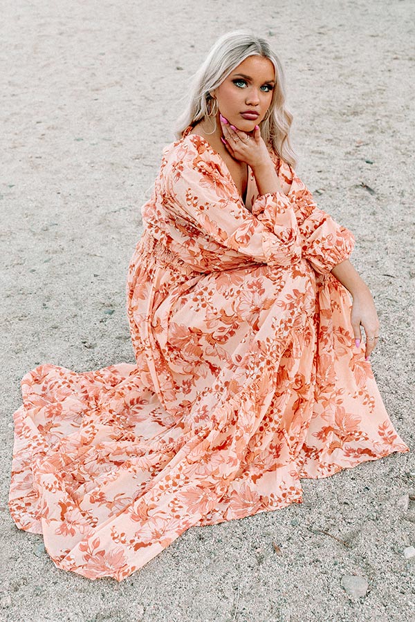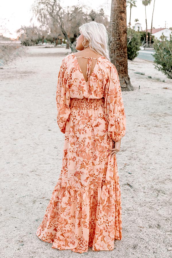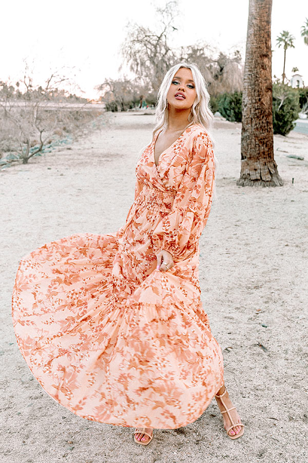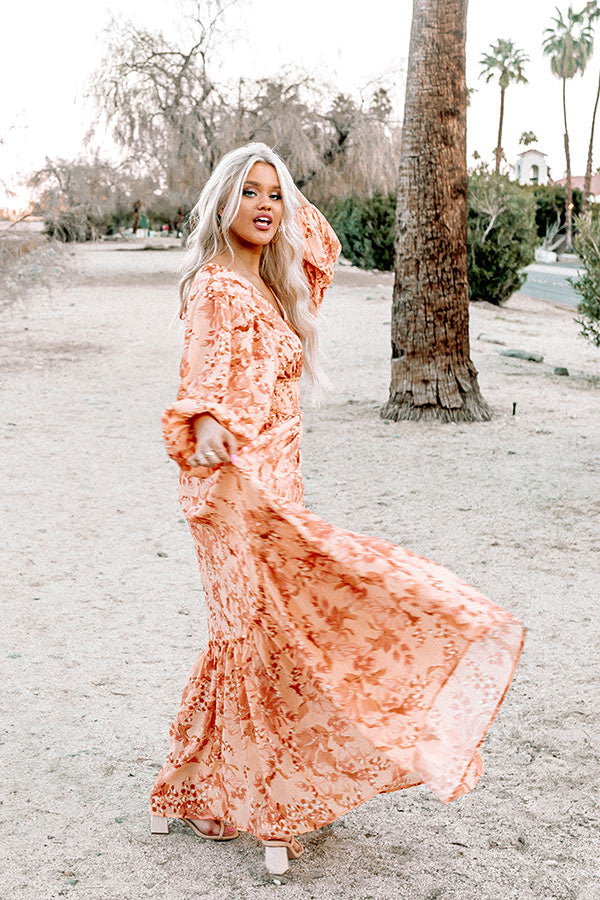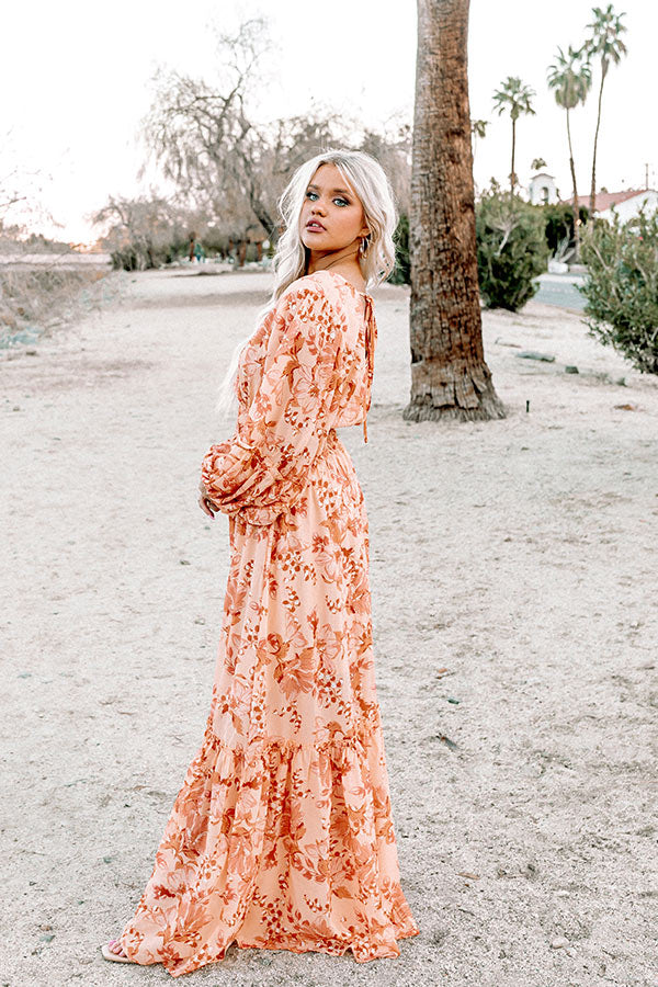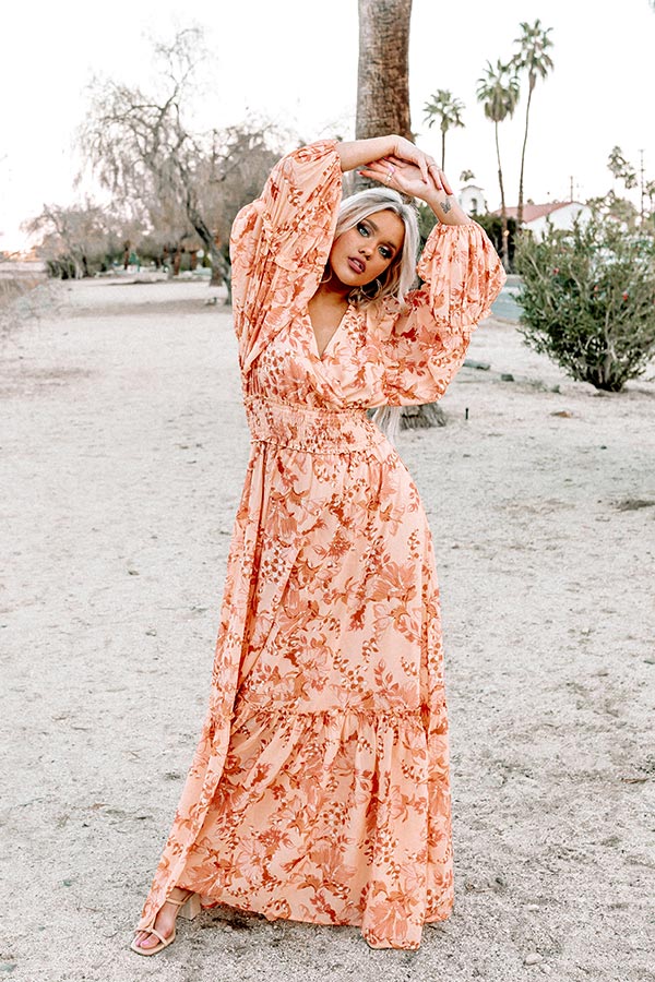 You will be channeling all the Caribbean vibes when you pack this beautiful light orange maxi dress for your summer vacay with its lightweight material, darker orange floral print, v-cut neckline and upper back with a tie closure, long lose sleeves, fitted waistline, and relaxed skirt silhouette that cascades into a straight floor-length hemline!