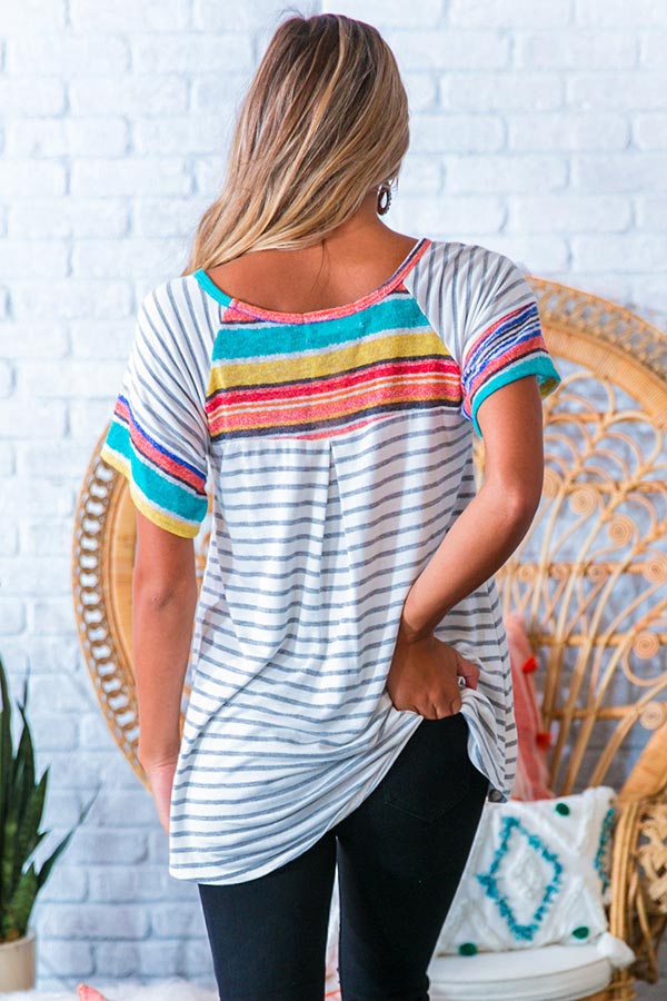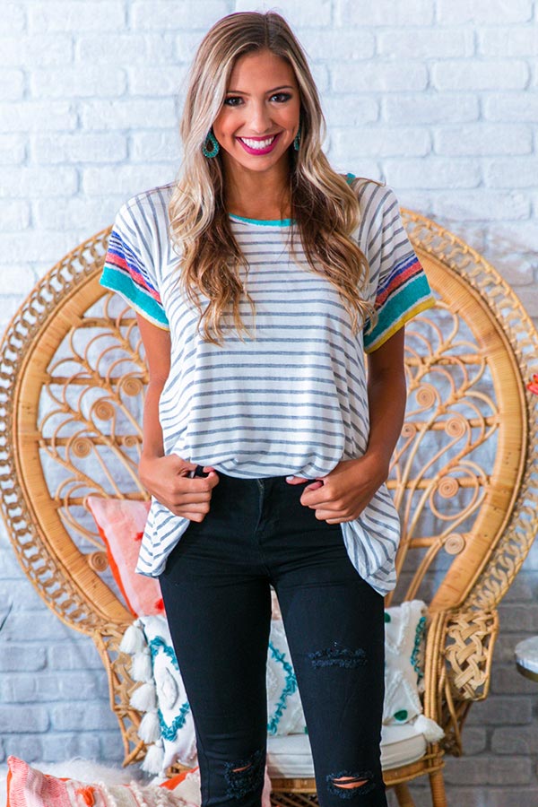 From coffee & carnivals to a concert in the park, this wear-anywhere tee has got your back! This colorful striped tee is comfy, cute & full of personality! Keep your look classic with denim cut-offs, or add a little edge to you look with a pair of distressed black skinny jeans... Your style options are endless with this "comfy cute" tee!