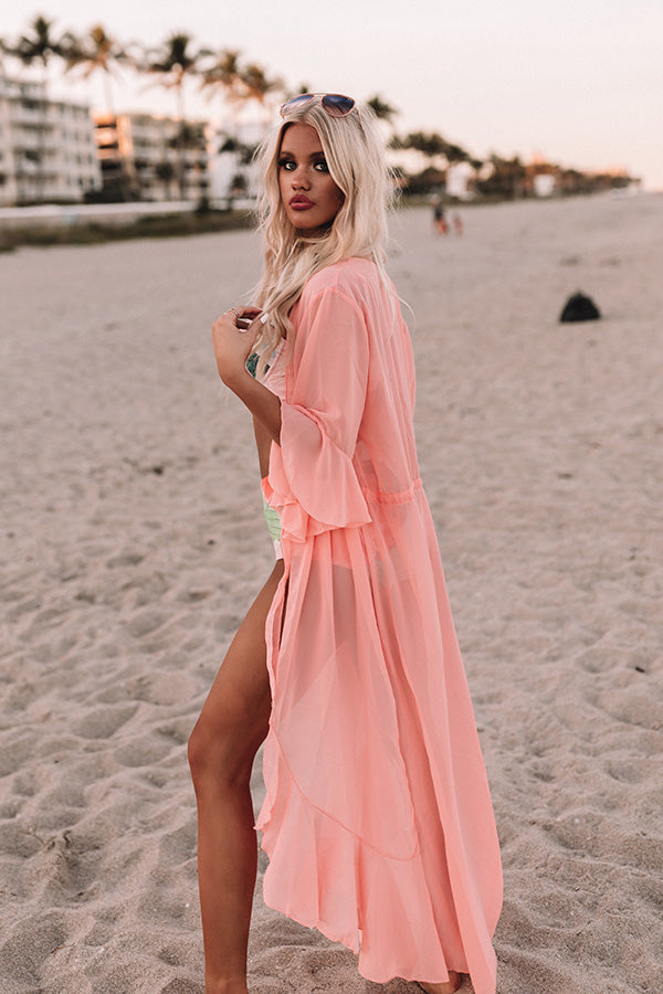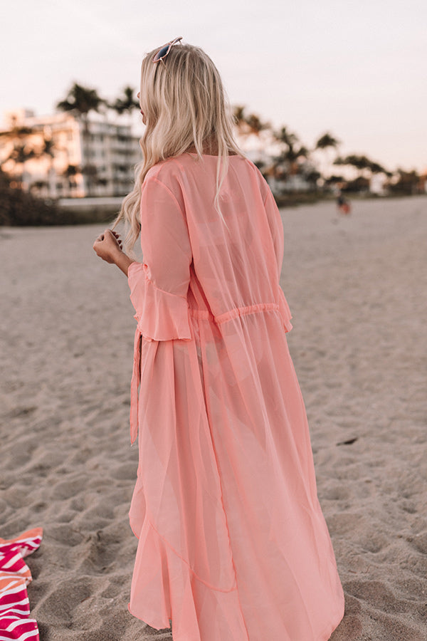 Plus Size - Cruise into summer like a true fashionista in this adorable coral hued overlay featuring ultra lightweight and breezy chiffon material, oversized half sleeves with flared ruffle cuffs, a cinched waistline with a tie belt, and an ultra draped open front silhouette that cascades into a ruffled ankle-length tulip hemline! Measurements