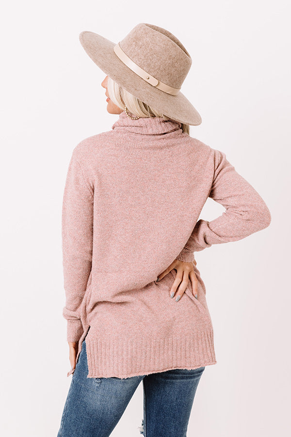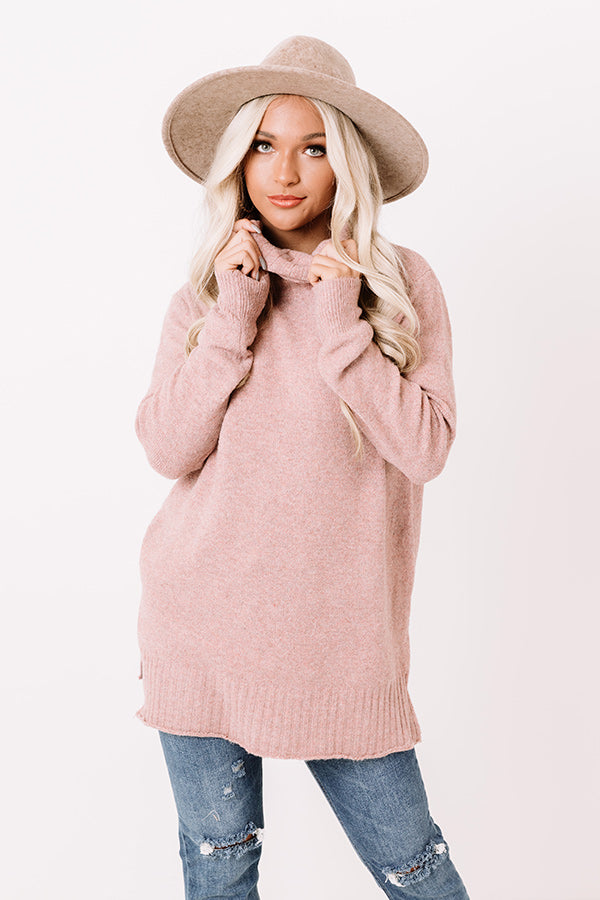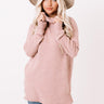 It's officially sweater weather...so keep warm in our stylish blush colored 'Carriage Ride' top featuring soft lightweight tight knit material, a rolled turtle neckline, long loose sleeves with fitted cuffs, ribbed trim detailing, and a slouched silhouette that falls into a straight tunic-length hemline with accent side slits! Measurements