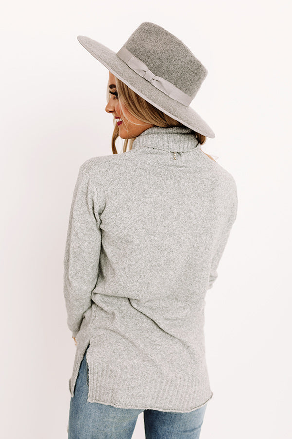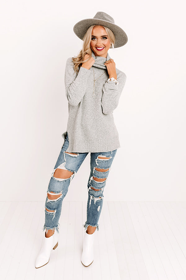 It's officially sweater weather...so keep warm in our stylish grey 'Carriage Ride' top featuring soft lightweight tight knit material, a rolled turtle neckline, long loose sleeves with fitted cuffs, ribbed trim detailing, and a slouched silhouette that falls into a straight tunic-length hemline with accent side slits!