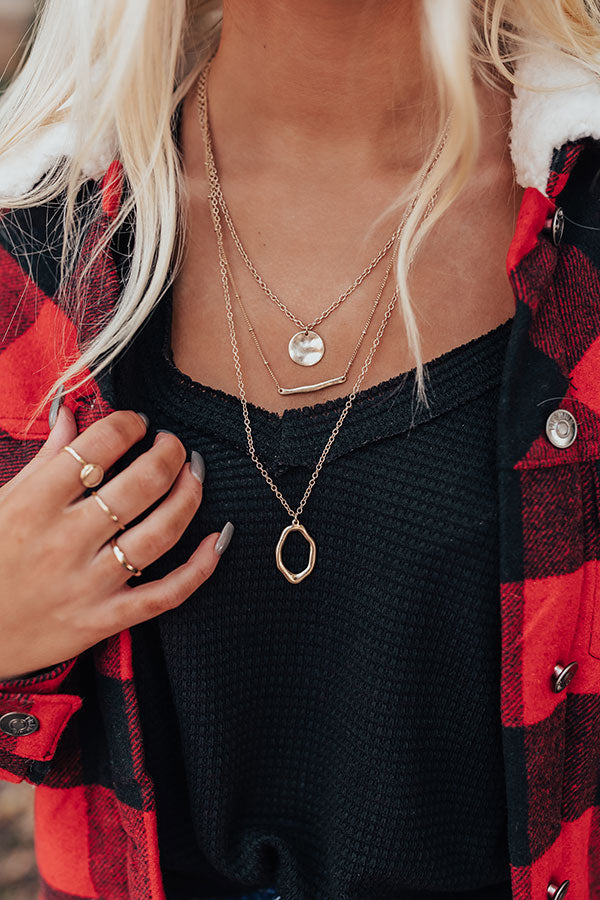 Add a bit of shine to any OOTD by accessorizing with our dainty "Carriage Ride" necklace featuring three layered gold chains with a circle pendant, a bar accent, and a hoop charm!