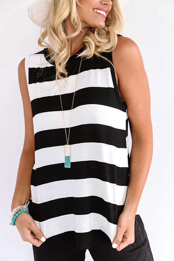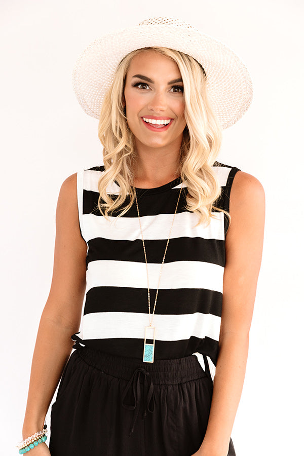 This casual but cute top is sure to make you smile with its lightweight material, black and white horizontal accent stripes, high rounded neckline, wide 3-inch sleeveless shoulder straps, and a relaxed silhouette that falls into a straight hemline! We have styled this beauty with some black pants and wedges, a matching hat, and a leopard crossbody, but you can also wear it with some distressed denim shorts and our ''Speed Stripe Slip On Sneaker!" Measurements