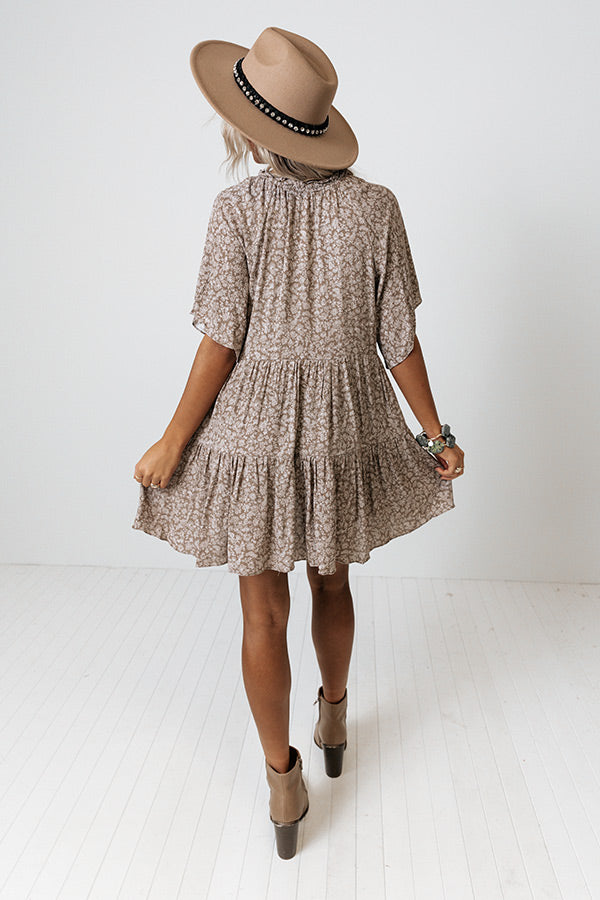 Keep your transitional wardrobe versatile with our casual cute taupe colored 'Carry Your Kisses Shift Dress' featuring soft lightweight and flowy material patterned with a white floral print, a v-cut neckline with a subtle ruffled collar, short sleeves, and a draped tiered silhouette that falls int a straight mid-thigh length hemline! Measurements