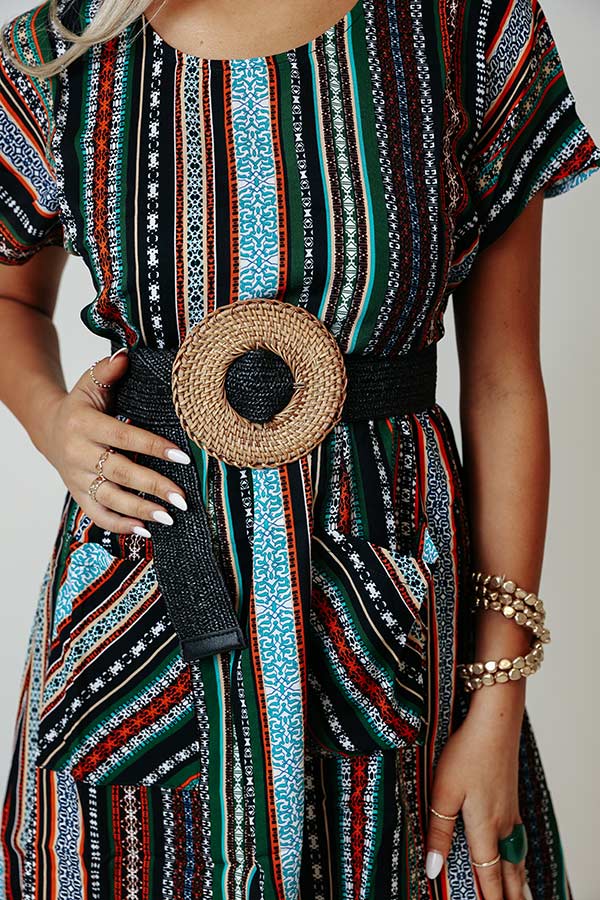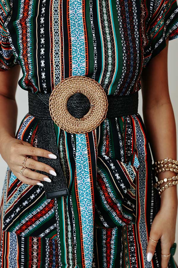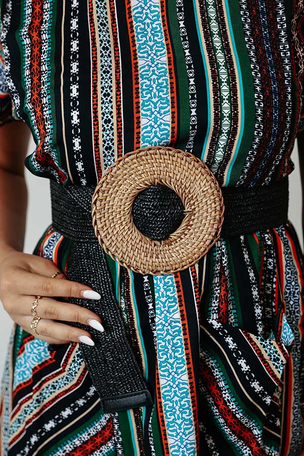 There is no better way to complete your look than with our trendy 'Casa On The Coast' belt featuring a wide woven black strap with an oversized woven raffia circle buckle!