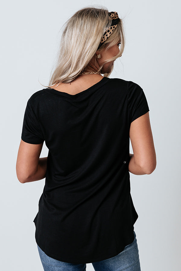 Keep your look simple but stylish in our basic black 'Casual Convo Shift Tee' featuring soft lightweight material, a v-cut neckline that can be worn off one side, a single accent chest pocket, short sleeves, and a slouched silhouette that ends in a rounded hemline that can be knotted! Measurements