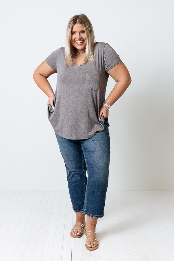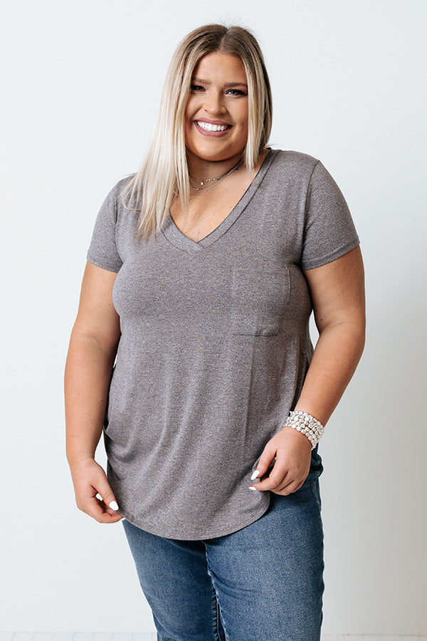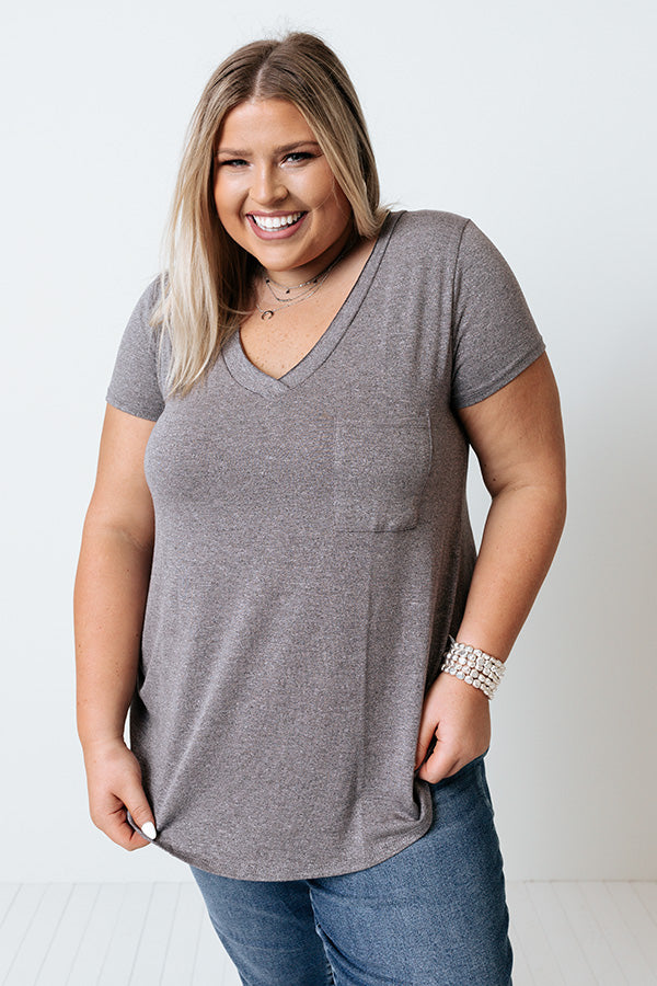 Plus Size - Keep your look simple but stylish in our basic lilac grey colored 'Casual Convo Shift Tee' featuring soft lightweight material, a v-cut neckline that can be worn off one side, a single accent chest pocket, short sleeves, and a slouched silhouette that ends in a rounded hemline that can be knotted!