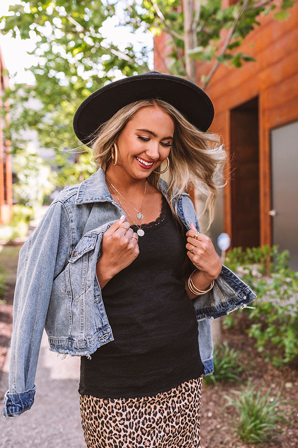 There is no better piece to wear on a casual Friday than this simple but significant black tank featuring lightweight stretchy material with subtle ribbed texturing, a scooped neckline and upper back, 2-inch shoulder straps, intricate lace trim detailing, and a form fitting silhouette that falls into a straight hemline!