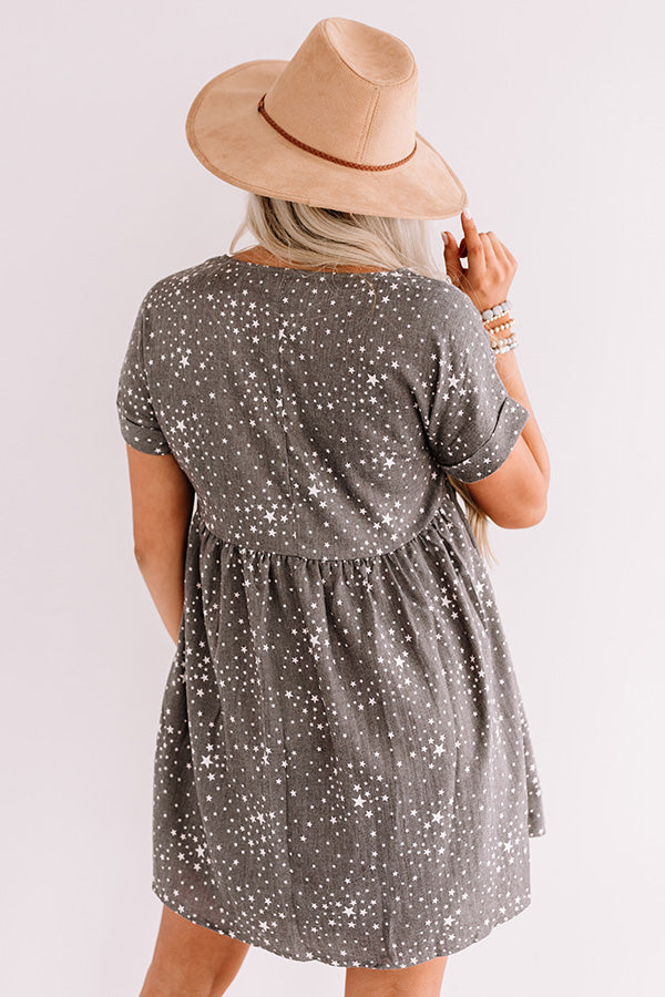 This gorgeous charcoal colored dress is perfect or any casual occasion with its lightweight material, adorable white star pattern, v-cut neckline, short loose sleeves with rolled cuffs, accent side pockets, and a relaxed babydoll silhouette that falls into an uneven mid-thigh length hemline! Measurements
