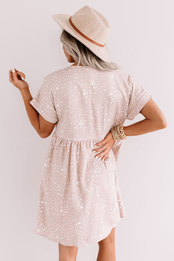 This gorgeous iced latte colored dress is perfect or any "casual occasion" with its lightweight material, adorable white star pattern, v-cut neckline, short loose sleeves with rolled cuffs, accent side pockets, and a relaxed babydoll silhouette that falls into an uneven mid-thigh length hemline! Measurements