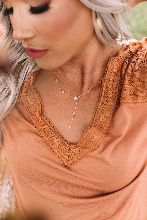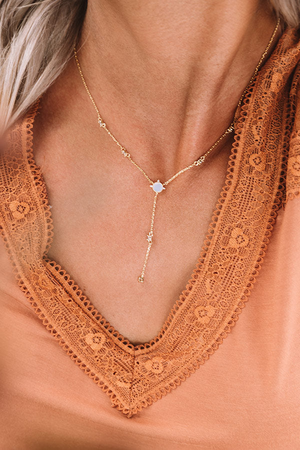 Dress up your OOTD for a casual occasion with this adorable necklace featuring a dainty gold chain with a small white charm and subtle shimmering rhinestones!