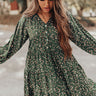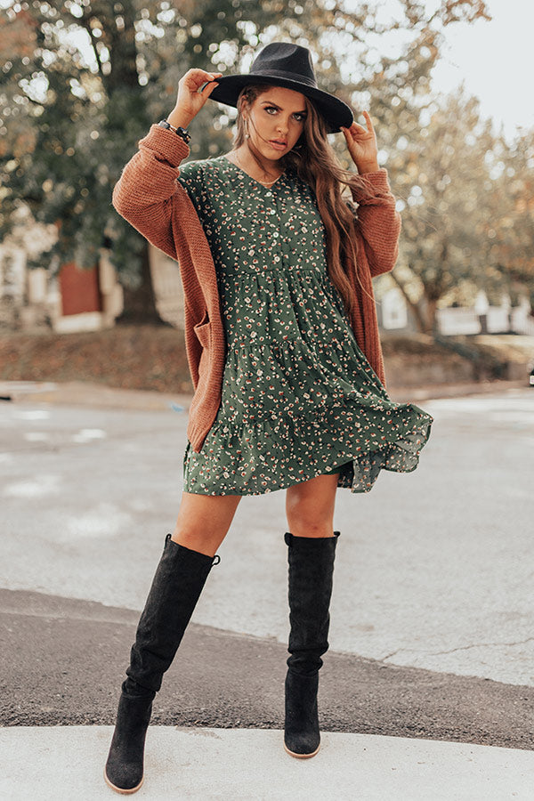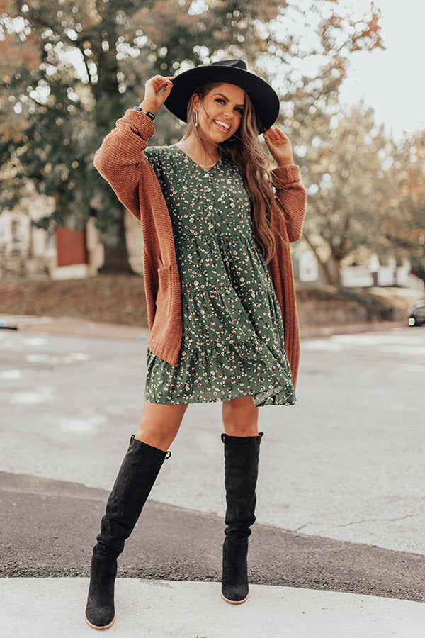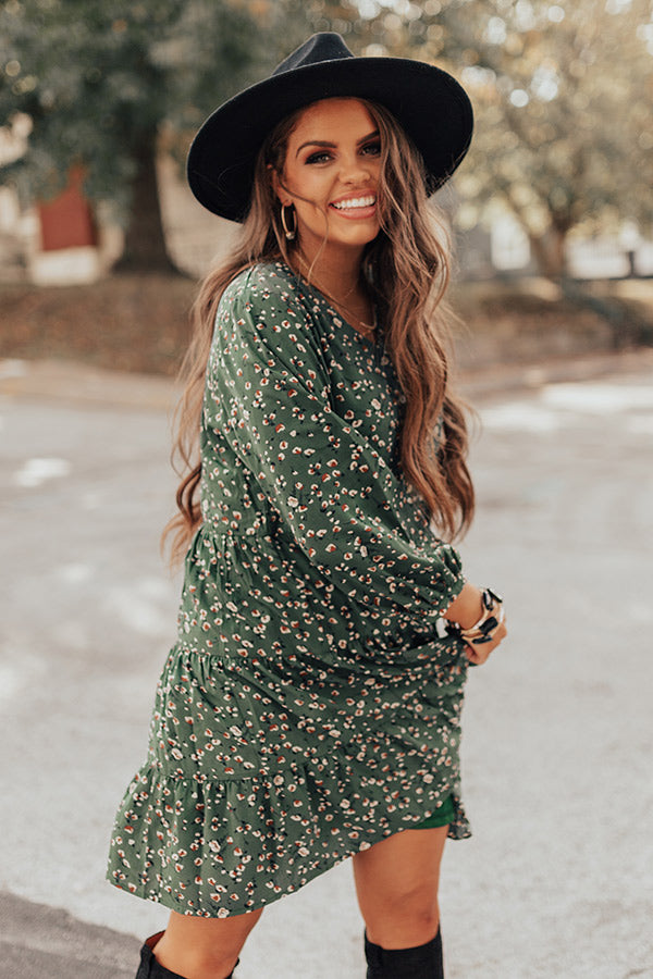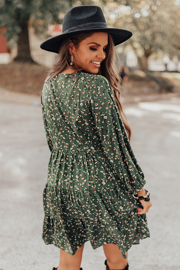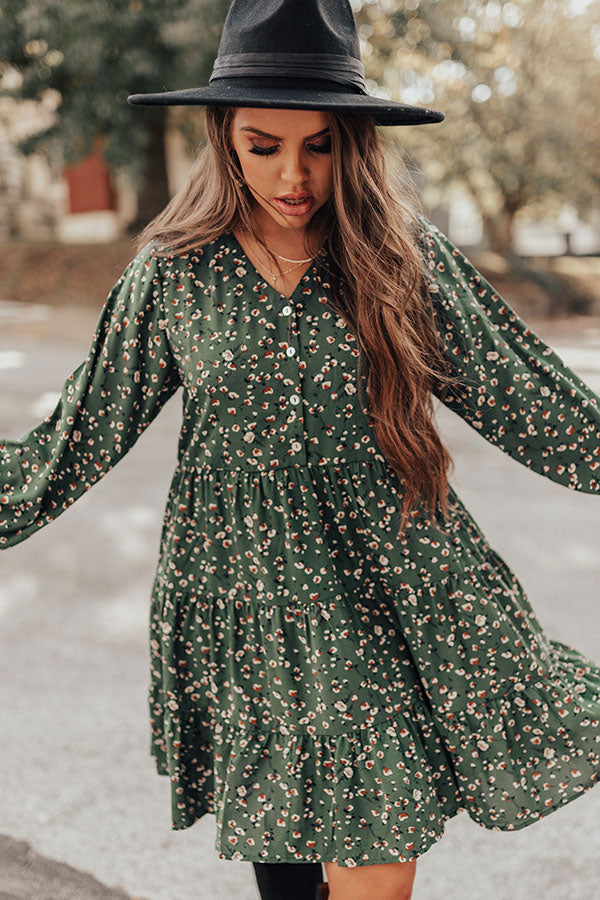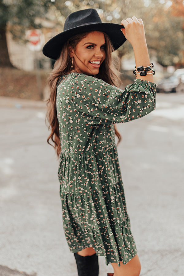 Enjoy a casual outing in style with this darling olive colored shift dress featuring lightweight flowy material decorated with a small floral print, loose 3/4-length sleeves with fitted cuffs, a button up bodice with a v-cut neckline, and a tiered skirt silhouette that cascades into an uneven mid-thigh length hemline! Measurements