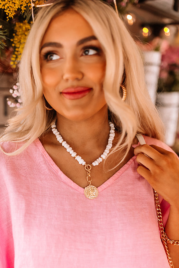 Upgrade your look in most casual of ways with this cute necklace featuring a short white semi precious beaded chain with a gold coin accent!
