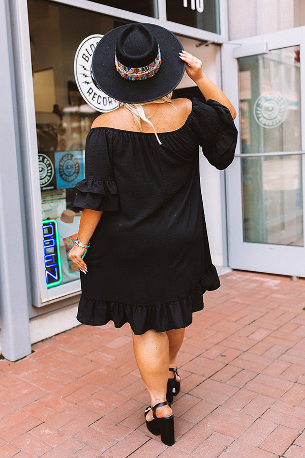 Plus Size - Arrive in style with our charming black 'Casually Courting Shift Dress' featuring lightweight flowy material, an elastic off shoulder fit with a straight neckline, loose half drop sleeves with two tiered ruffle cuffs, and a relaxed silhouette that falls into a ruffled mid-thigh length hemline! Measurements
