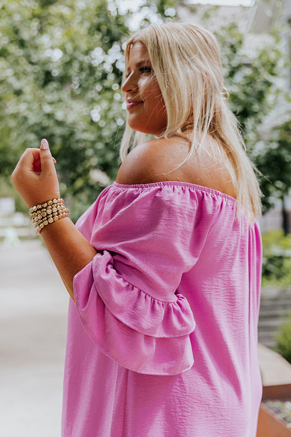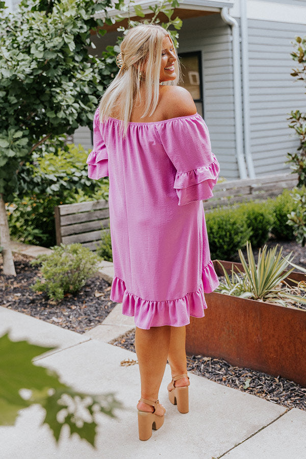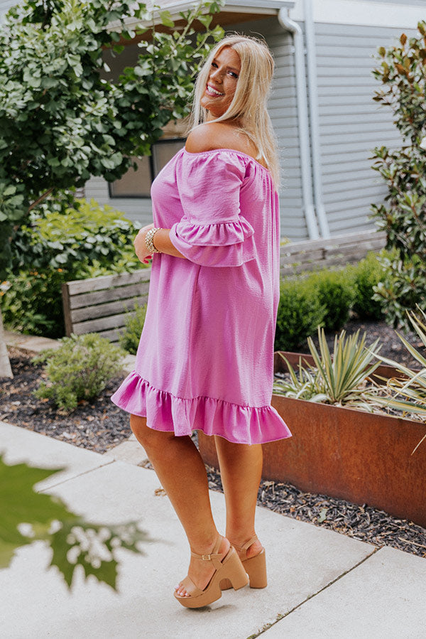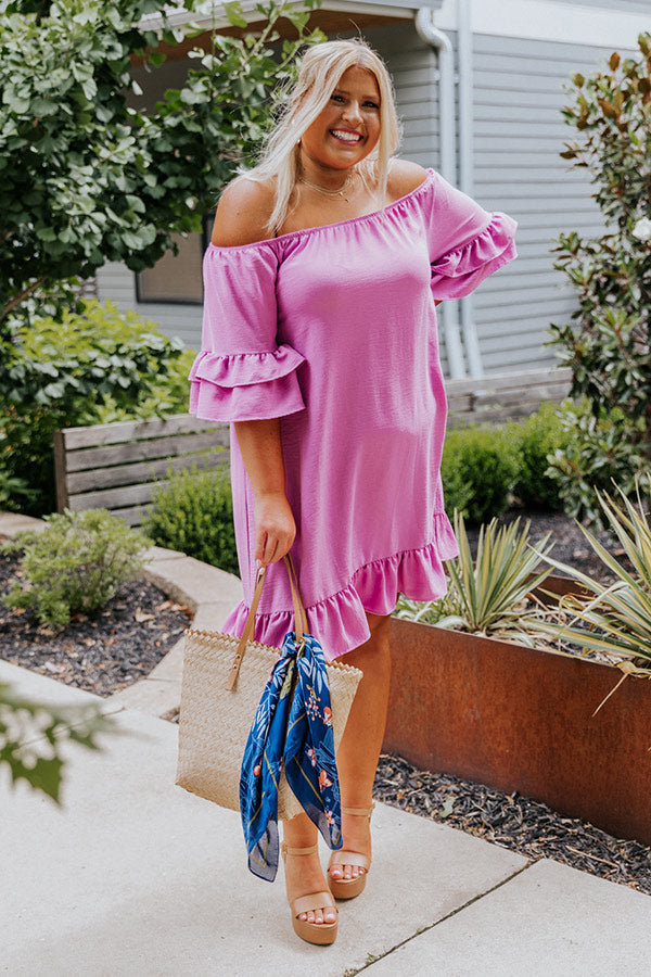 Plus Size - Arrive in style with our charming lavender 'Casually Courting Shift Dress' featuring lightweight flowy material, an elastic off shoulder fit with a straight neckline, loose half drop sleeves with two tiered ruffle cuffs, and a relaxed silhouette that falls into a ruffled mid-thigh length hemline!