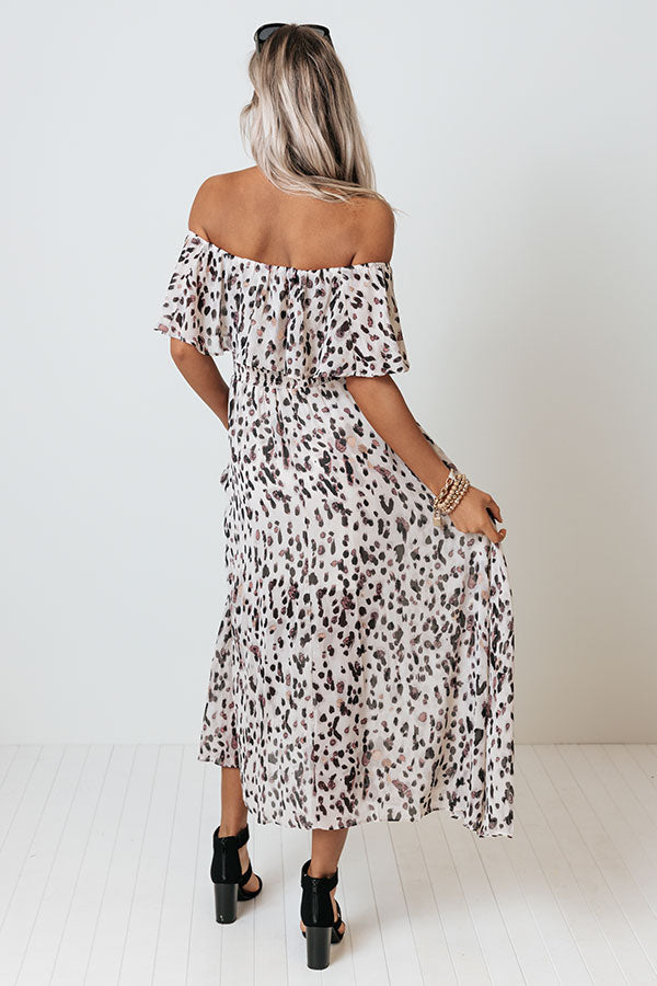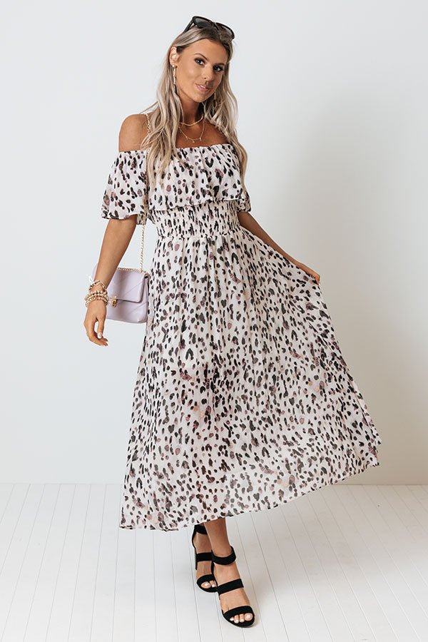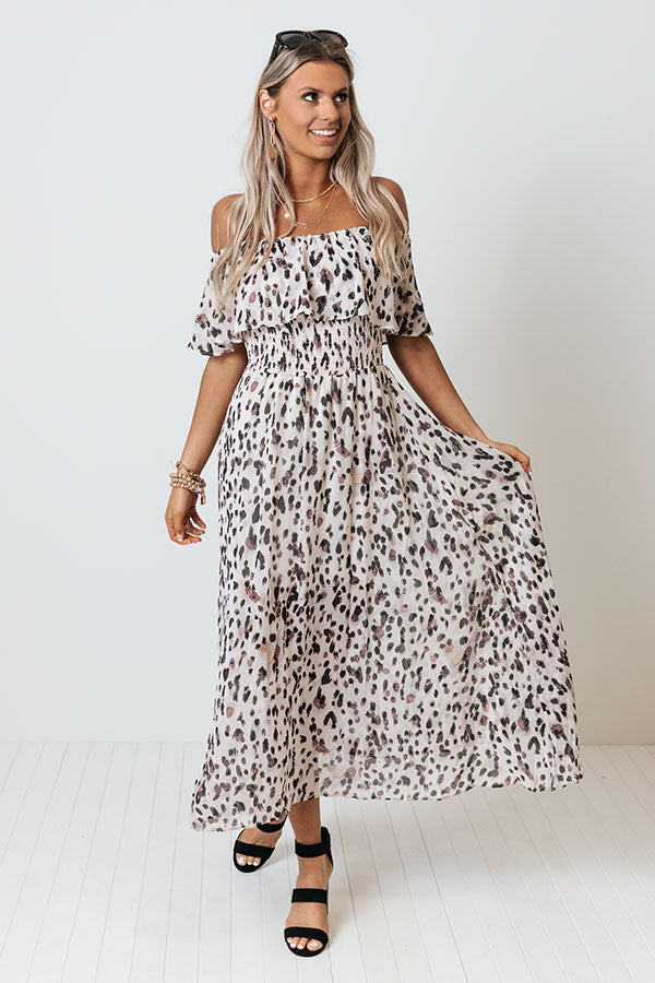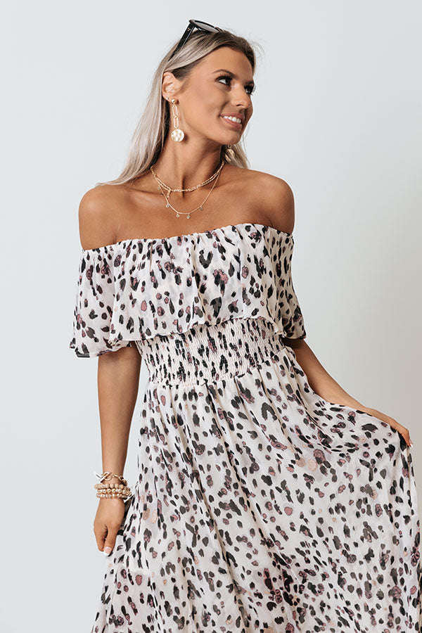 You are sure to look cute on the Catalina coastline when you wear this gorgeous cream hued maxi dress featuring lightweight breezy material patterned with an adorable leopard print, an elastic off shoulder fit with a straight neckline, an overlay bodice with short drop sleeves, a fitted smocked bodice, and a relaxed skirt silhouette that cascades into a straight mid-calf length hemline! Measurements