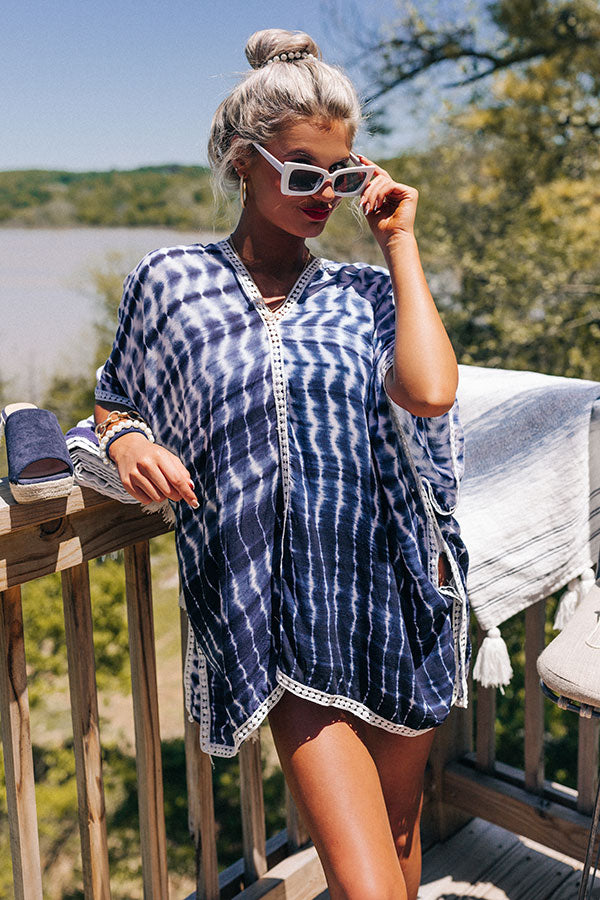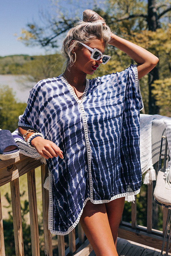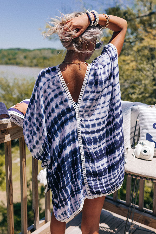Coast into summer looking amazing in this eye-catching overlay featuring lightweight breezy material patterned with navy tie dye, a v-cut neckline and upper back, oversized batwing sleeves, crochet accent trim, and an ultra draped silhouette that cascades into a straight mid-thigh length hemline! Measurements