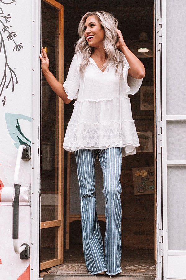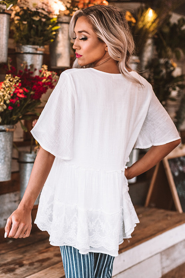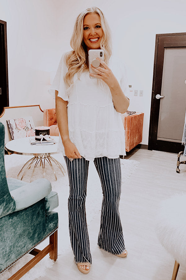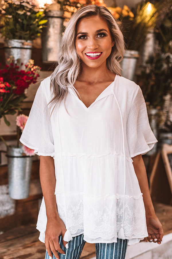 You are sure to be a "Catalina cutie" when you wear this adorable white shift top featuring lightweight breezy layered material, a v-cut neckline with a tie string closure, loose flounced short sleeves, a ruffled accent seam, and a relaxed silhouette that falls into a peplum bottom with intricate lace detailing and an uneven hemline! We have styled this cutie with some pin stripe flares and neutral wedges, but you can also wear it with some distressed denim shorts, "The Underwood Faux Leather Wedge in Blush," and our "Pass The Prosecco Wool Hat in Blush!" Measurements