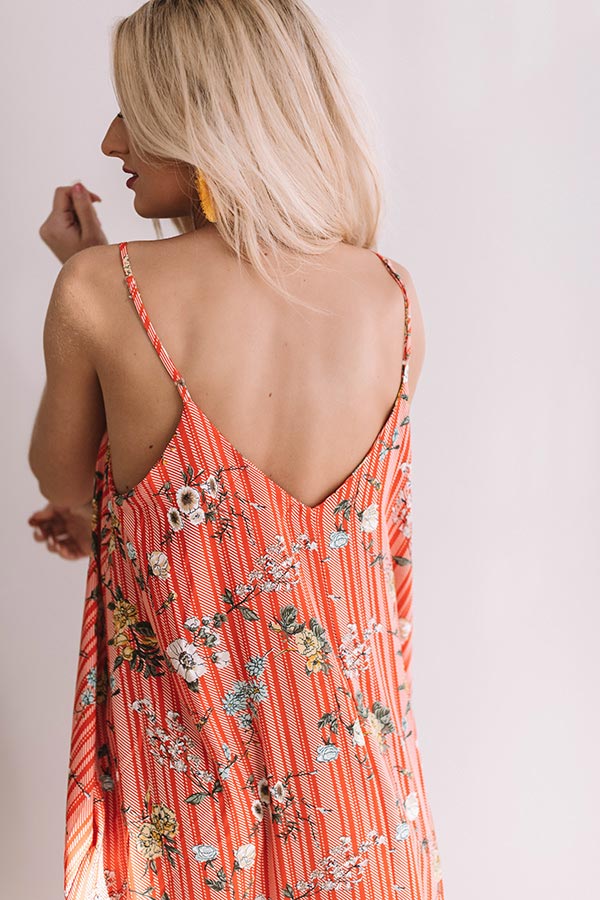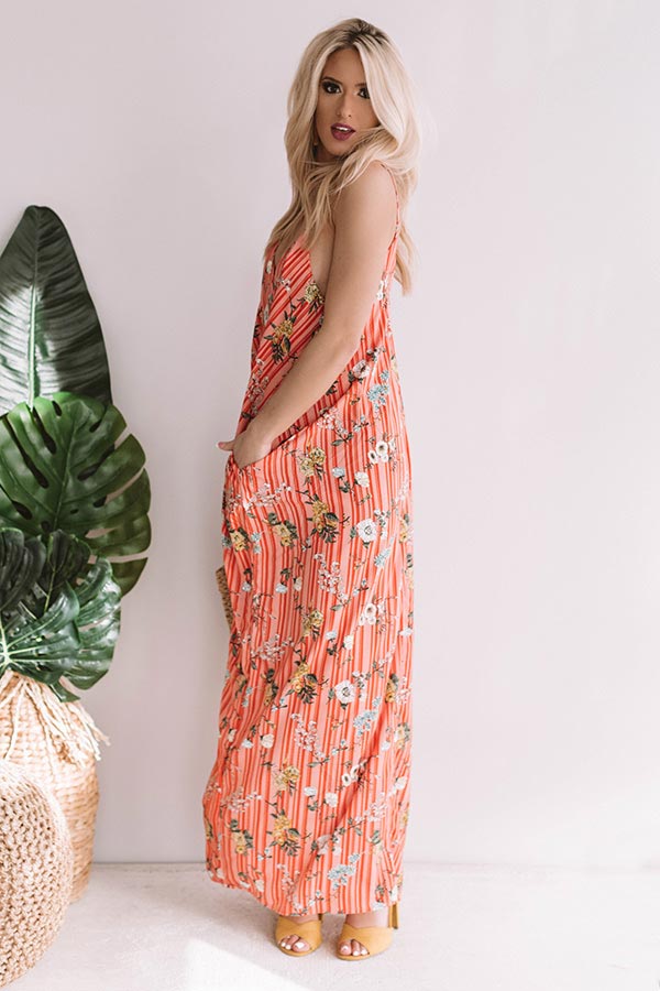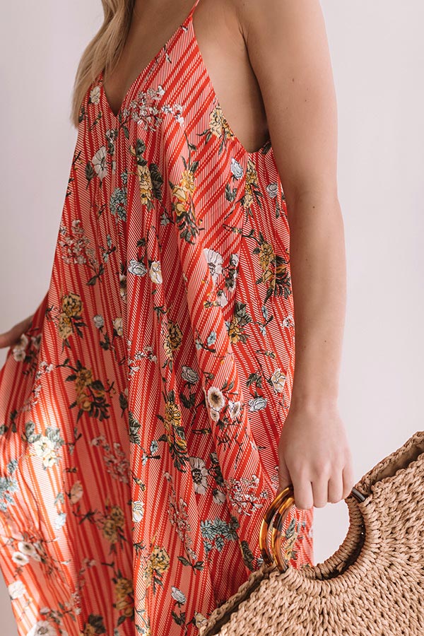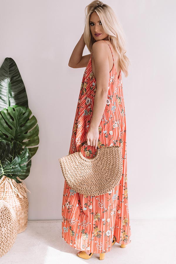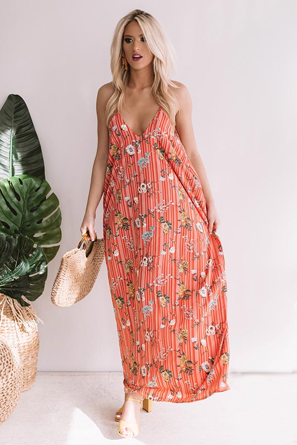 Escape to Catalina Island in this paradise ready maxi dress! This tangerine striped maxi dress is decorated with a variety of floral blooms & features thin adjustable straps, & an ultra relaxed poly silhouette (with side pockets) that is as comfy as it is cute. Slip on your favorite sandals & add a colorful statement earring for a comfortably chic look in minutes!