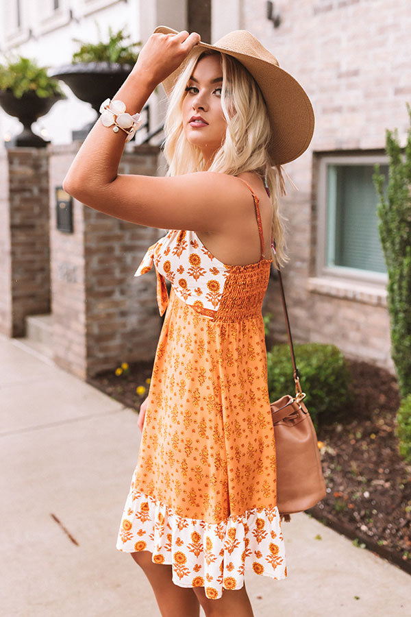 Arrive in style with our stunning persimmon colored "Catalina Summer" dress featuring lightweight breezy material patterned with various intricate floral prints, a scooped neckline with a front tie closure, adjustable spaghetti straps with a smocked back, and a relaxed skirt silhouette that falls into a wide uneven lower-thigh length hemline! We have paired this gorgeous piece with some white wedges booties and a brown bucket bag and hat, but you can also wear it layered under a distressed denim jacket with "The Mara Sandal in Persimmon" and our "Sippin' At Sunset Sunnies in White!" Measurements
