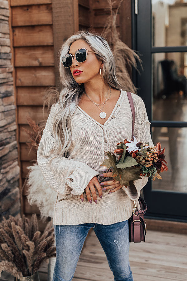 We guarantee you won't catch a chill when you complete your look with this cute beige colored top featuring soft tight knit material with thick ribbed trim detailing, a button up bodice with a v-cut neckline, long loose sleeves with oversized rolled cuffs, and a slouched silhouette that falls into a straight hemline! Measurements