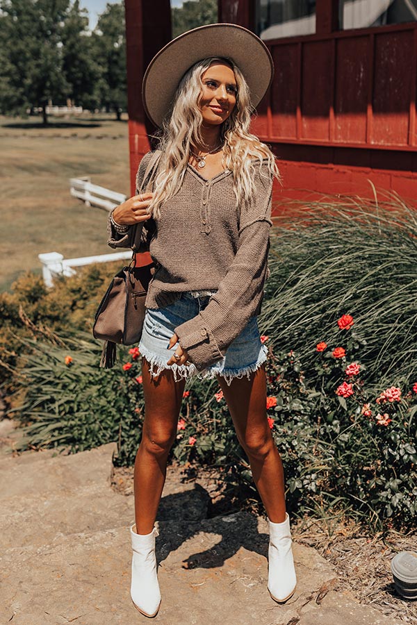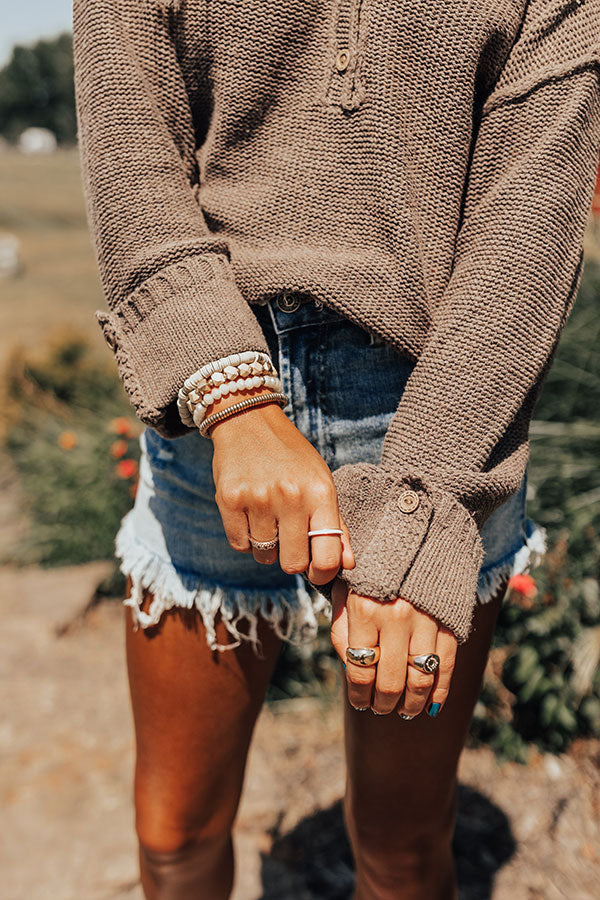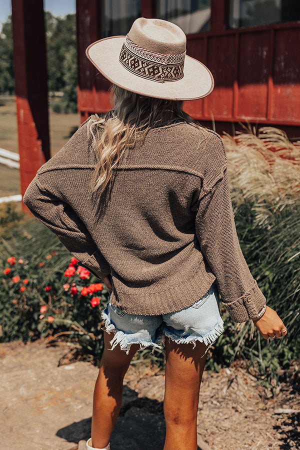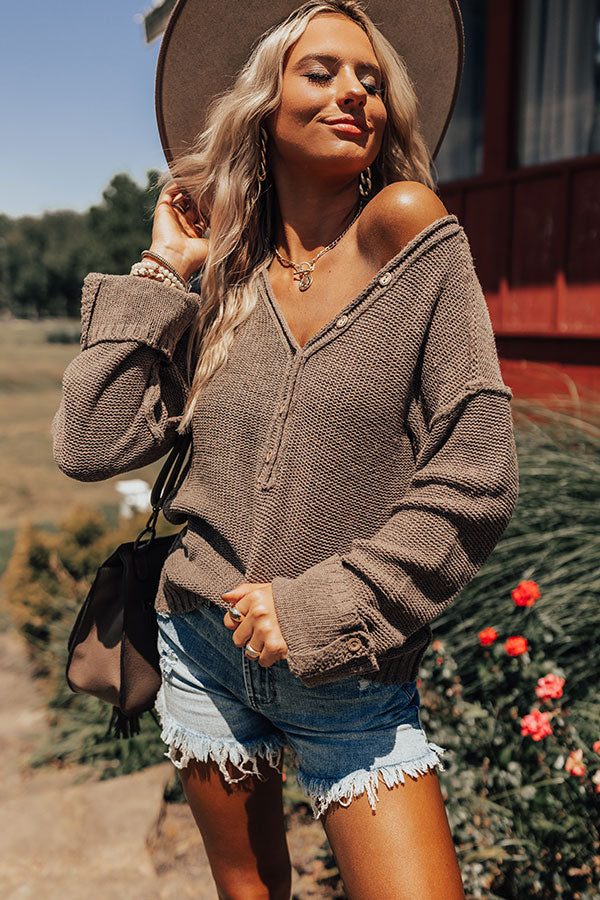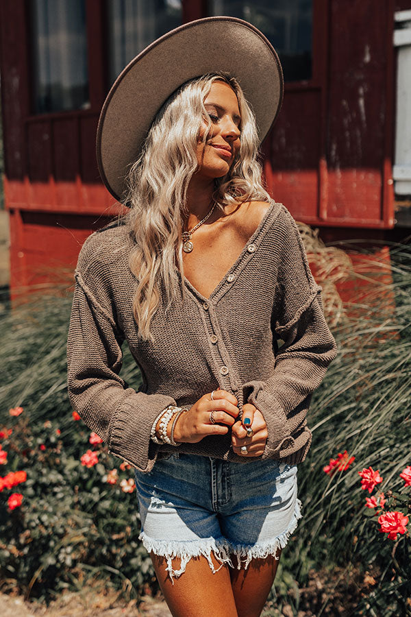 We guarantee you won't catch a chill when you complete your look with this cute espresso colored top featuring soft tight knit material with thick ribbed trim detailing, a button up bodice with a v-cut neckline, long loose sleeves with oversized rolled cuffs, and a slouched silhouette that falls into a straight hemline! Measurements