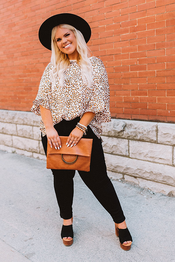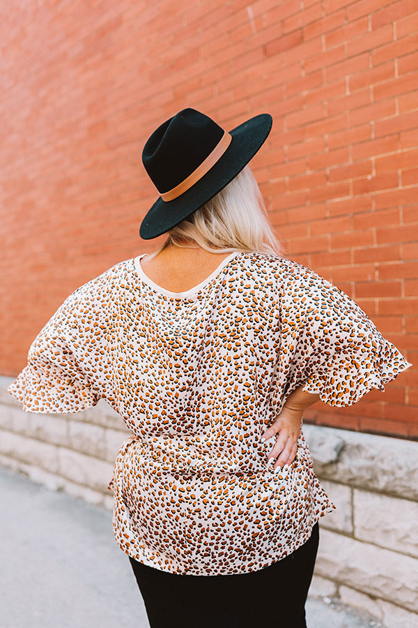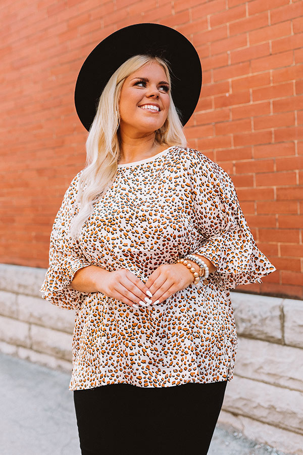 Plus Size - Take a walk on the wild side in our pretty 'Catch A Thrill' top featuring lightweight material patterned with a black and camel hued leopard print, a rounded neckline, short loose sleeves with flared ruffle cuffs, and a slouched silhouette that falls into a rounded hemline! Measurements