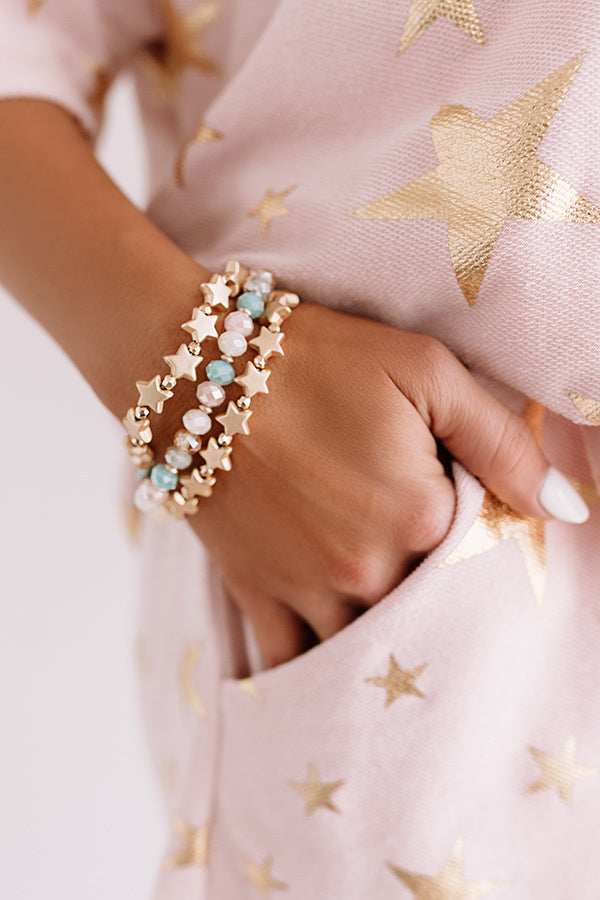 You will surely be "catching" compliments when you accessorize with this dainty bracelet set featuring three stretchy pieces with gold stars and rounded rose quartz and blue colored beads!