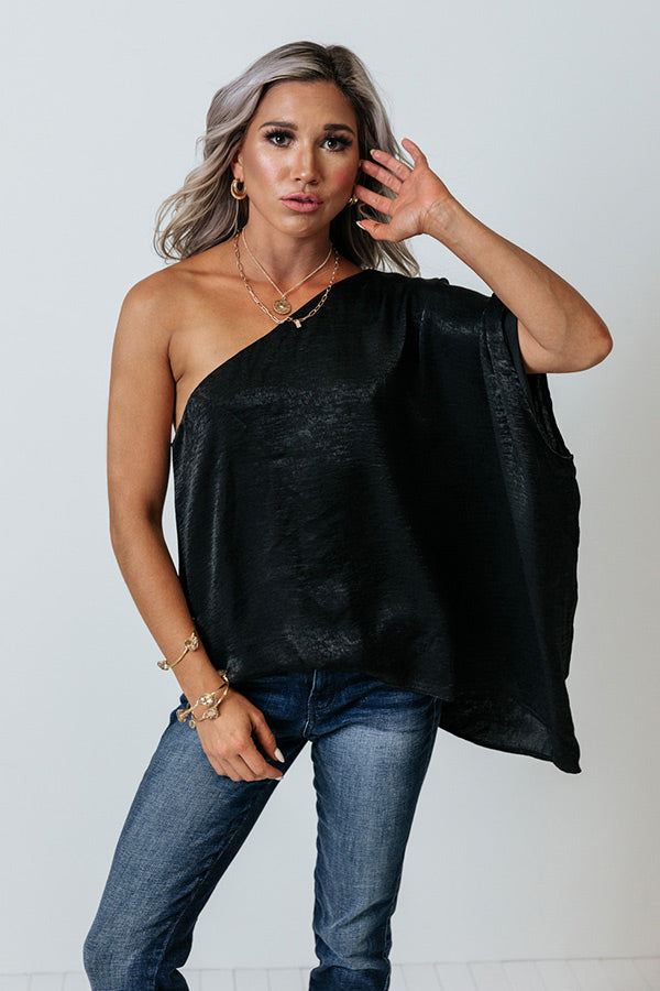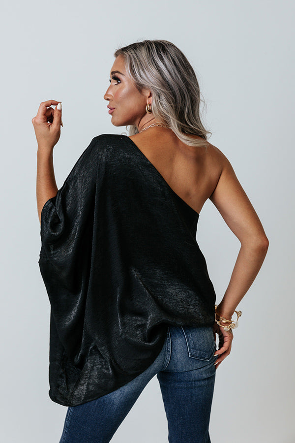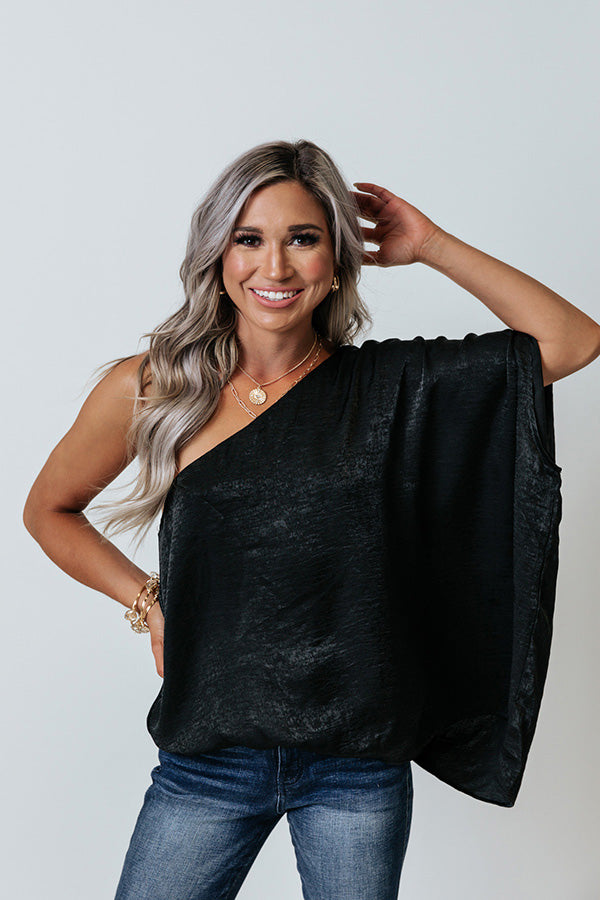 People are sure to crush on you when you arrive in this pretty black top featuring lightweight satin material, a diagonal neckline and upper back with a single oversized 3/4-length bat wing sleeve, and an ultra draped silhouette that falls into an uneven hemline! Measurements