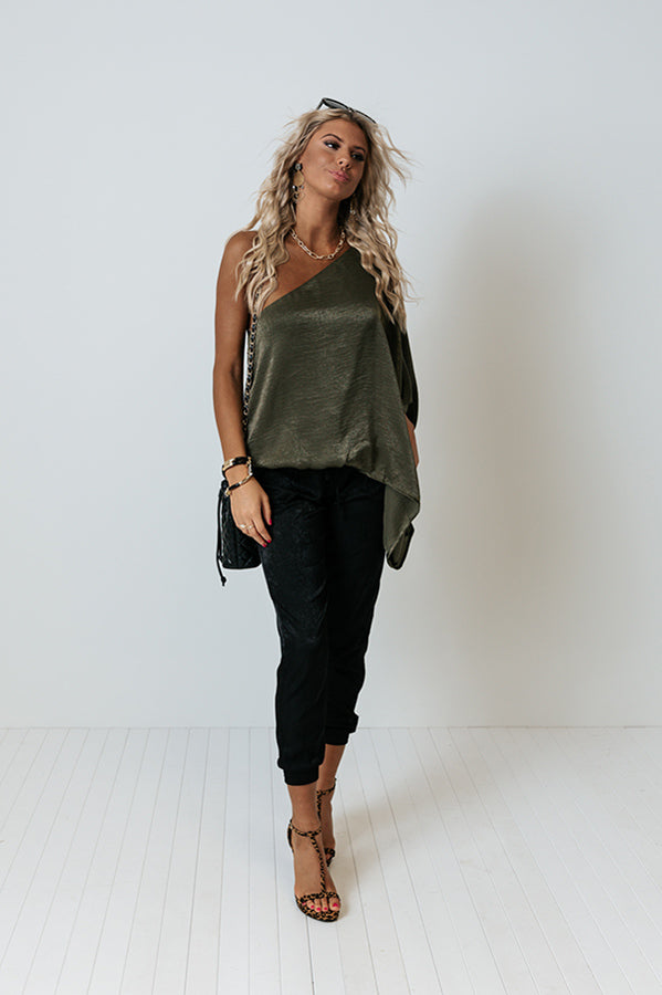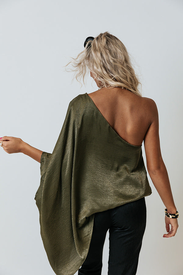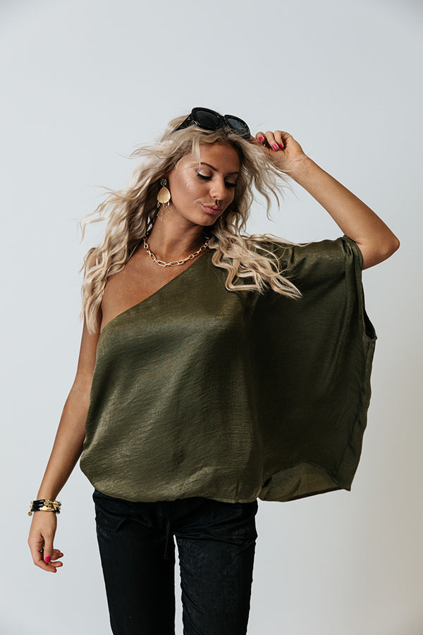 People are sure to crush on you when you arrive in this pretty martini olive hued top featuring lightweight satin material, a diagonal neckline and upper back with a single oversized 3/4-length bat wing sleeve, and an ultra draped silhouette that falls into an uneven hemline!