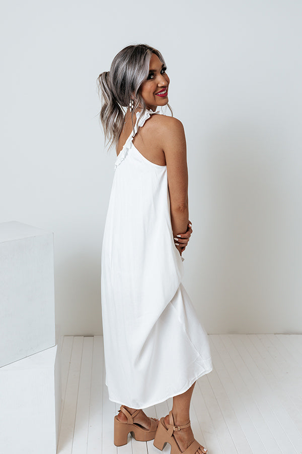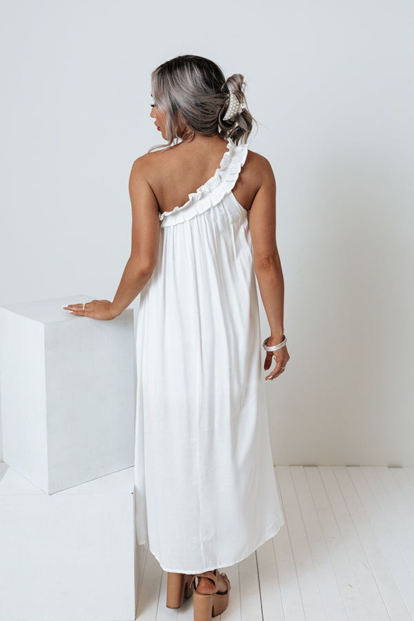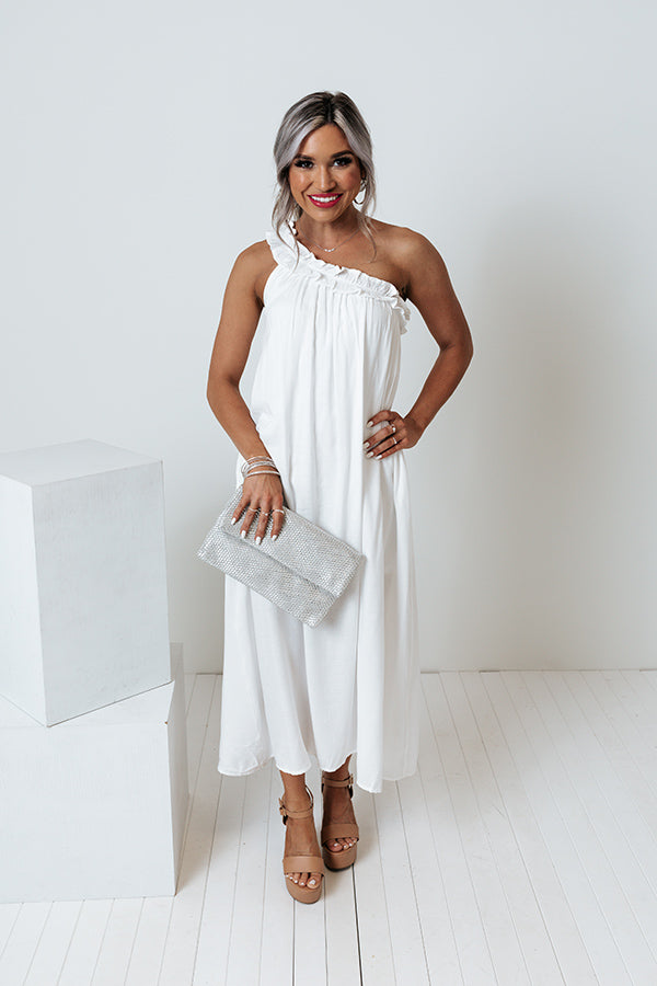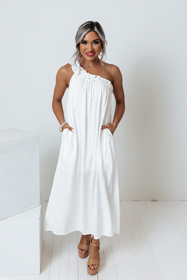 You will look like you just strutted right off the catwalk when you arrive in this chic white midi dress featuring lightweight flowy material, a ruffled diagonal neckline and upper back with a single shoulder strap, hidden side pockets, and an ultra relaxed but flattering silhouette that cascades into a straight mid-calf length hemline! Measurements