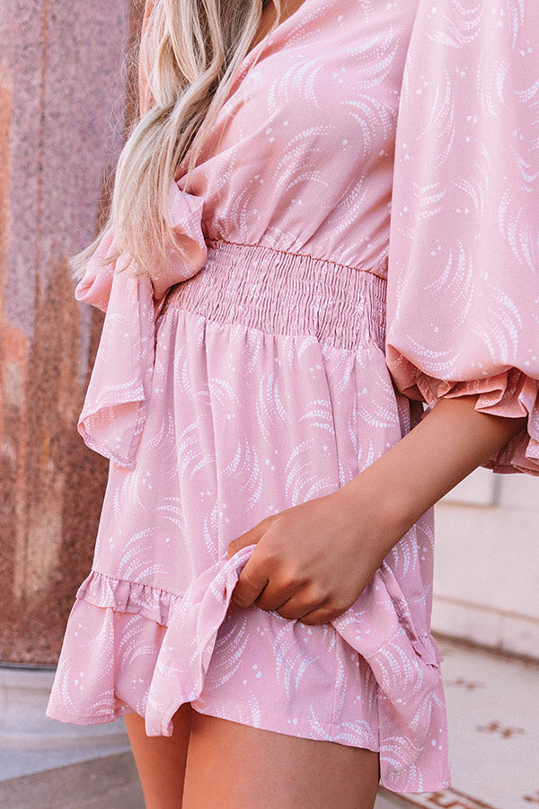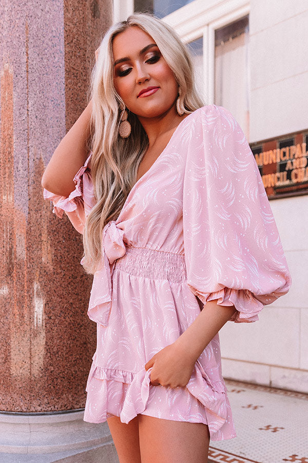 We have no doubt you will be "caught in a moment" when you wear this stunning rose quartz romper featuring lightweight breezy material patterned with a subtle white print, a v-cut neckline with an oversized tied closure, long bubble sleeves with flared cuffs, a wide smocked waistline, and a relaxed skirt silhouette that falls into a peplum bottom with an uneven mid-thigh length hemline! We have styled this elegant piece with a simple white heel and clutch, but you can also wear it with "The Sydney Wedge in Gold" and our "Spread Your Wings Butterfly Hair Clip Set!" Measurements