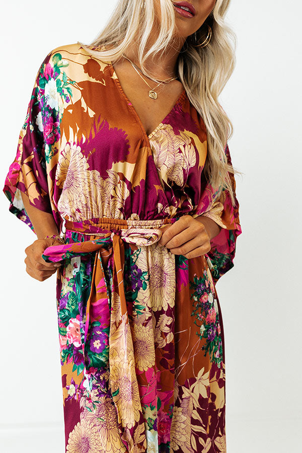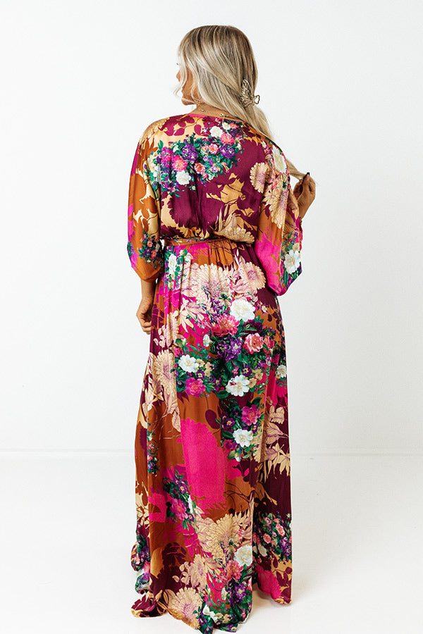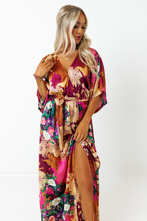 Your sure to fall in love with our " Caught Up in Love Satin Maxi" Featuring bold floral prints, a surplice neckline with a hidden snap for extra coverage, an elastic waistband with a detachable belt, a thigh high leg slit and a straight floor length hemline.