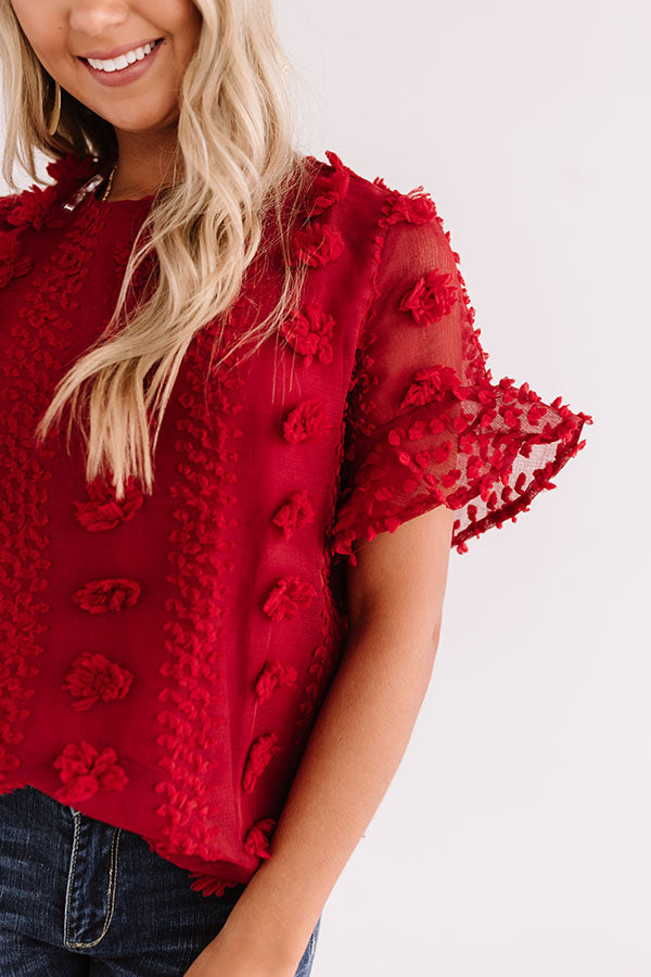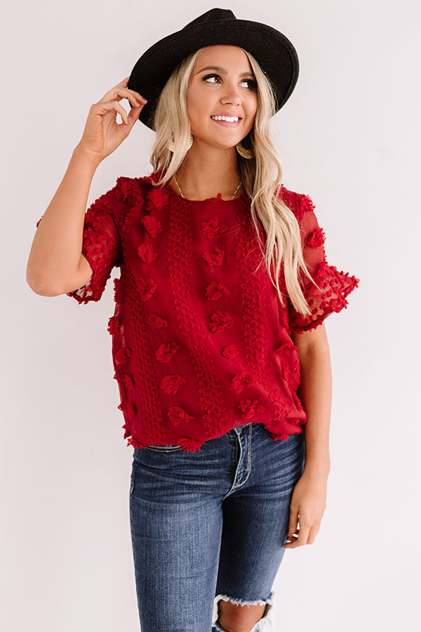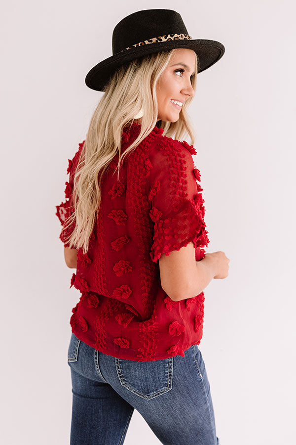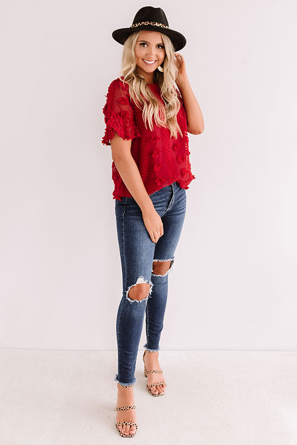 Wearing this adorable crimson colored shift top will give you a "cause for applause" with its lightweight semi-sheer layered material patterned with large and small polka dot texturing, a high rounded neckline, short loose sleeves with oversized flared cuffs, a keyhole accented upper back with a button closure, and a relaxed silhouette that falls into a straight hemline!
