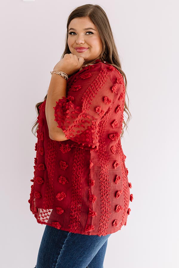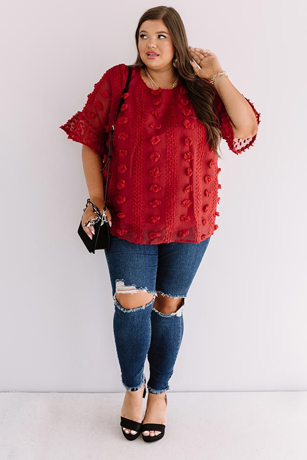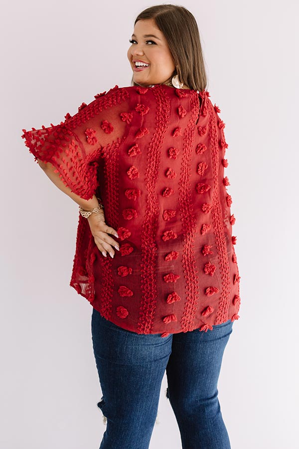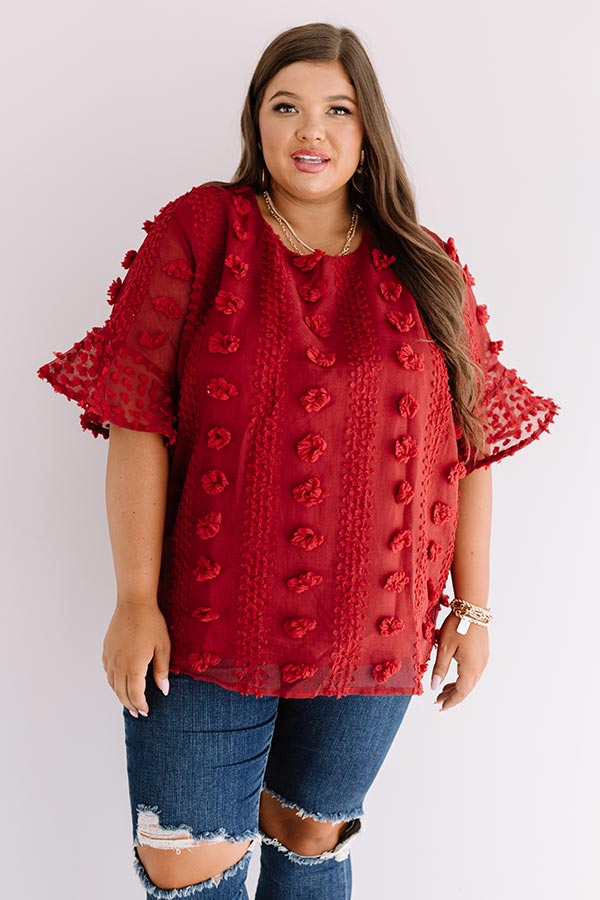 Plus Size - Wearing this adorable crimson colored shift top will give you a "cause for applause" with its lightweight semi-sheer layered material patterned with large and small polka dot texturing, a high rounded neckline, short loose sleeves with oversized flared cuffs, a keyhole accented upper back with a button closure, and a relaxed silhouette that falls into a straight hemline! We have styled this unique piece with some frayed skinnies and a wool hat, but you can also wear it with some distressed black shorts, "The Jess Faux Leather Heel in Warm Taupe," and our "Chic Harmony Fringe Tote in Black!"