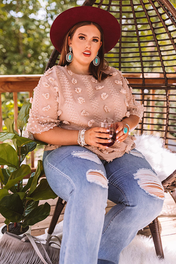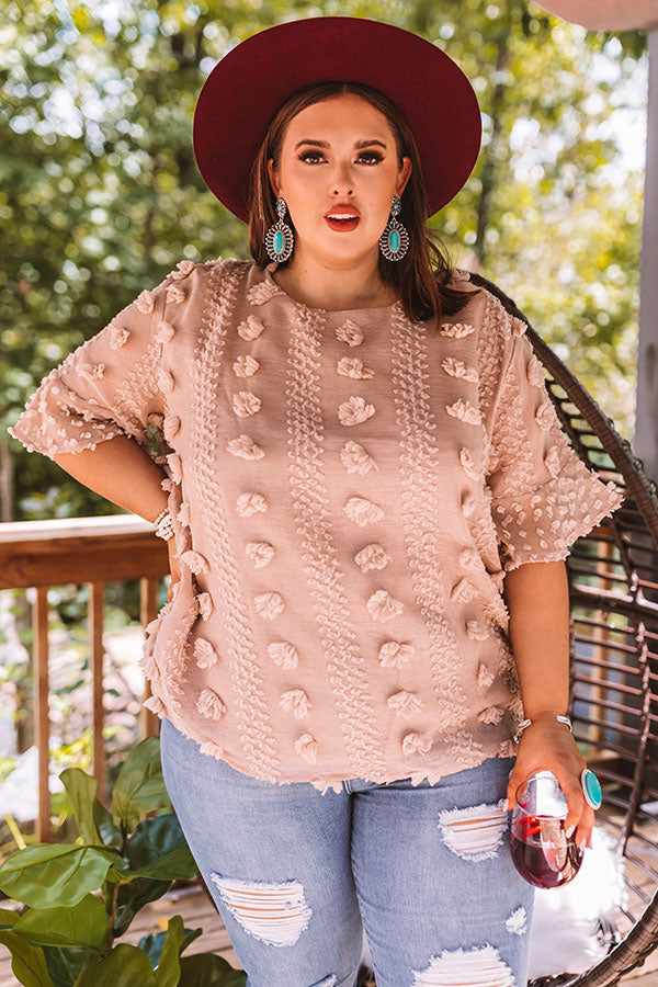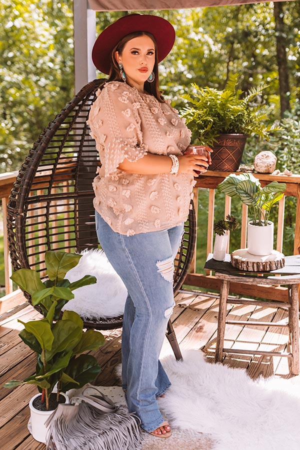 Plus Size - Wearing this adorable taupe colored shift top will give you a "cause for applause" with its lightweight semi-sheer layered material patterned with large and small polka dot texturing, a high rounded neckline, short loose sleeves with oversized flared cuffs, a keyhole accented upper back with a button closure, and a relaxed silhouette that falls into a straight hemline! We have styled this unique piece with some distressed light wash flares, neutral mules, a wool hat, and a fringe faux leather tote, but you can also wear it with some black skinnies and "The Jess Faux Leather Heel in Warm Taupe!"