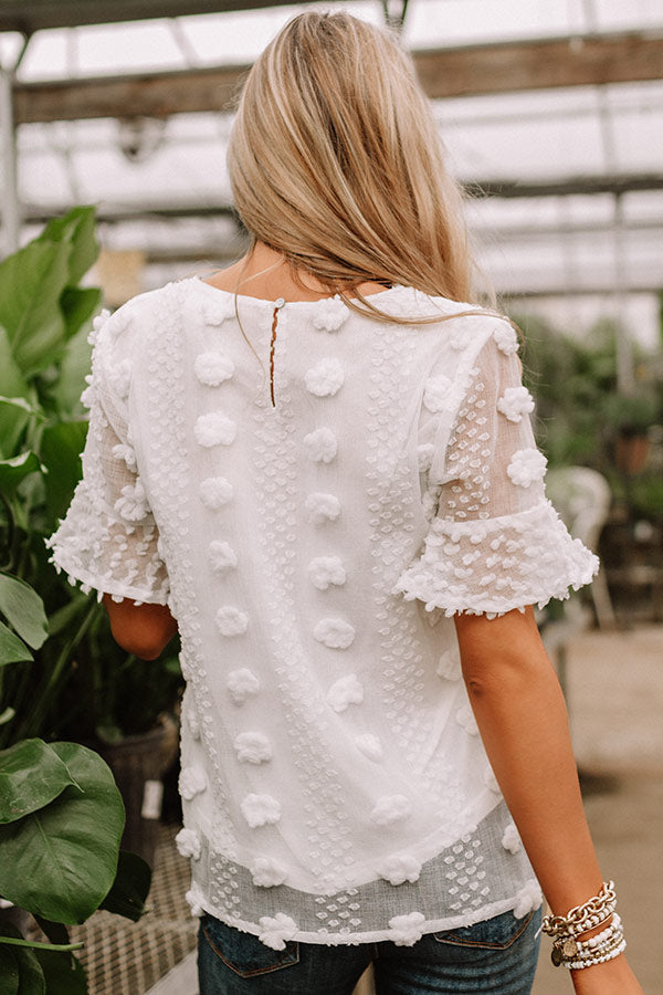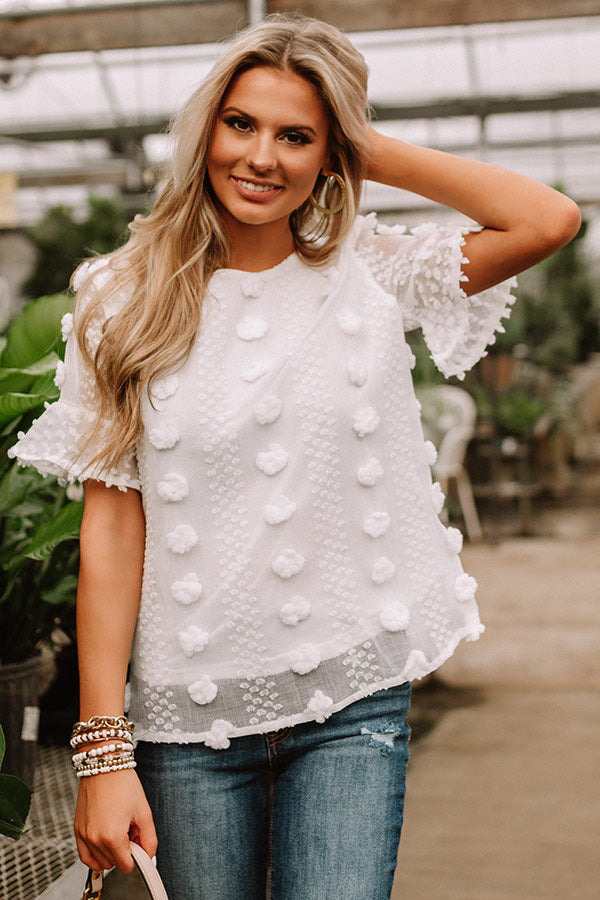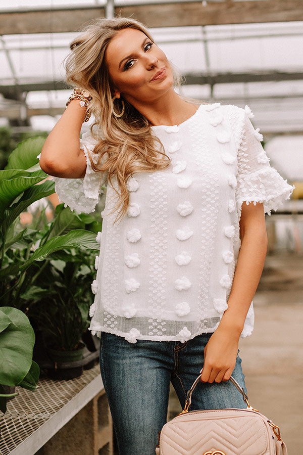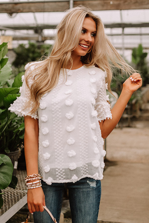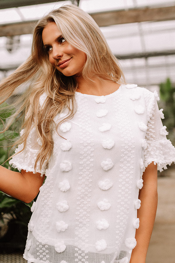 Wearing this adorable white shift top will give you a "cause for applause" with its lightweight semi-sheer layered material patterned with large and small polka dot texturing, a high rounded neckline, short loose sleeves with oversized flared cuffs, a keyhole accented upper back with a button closure, and a relaxed silhouette that falls into a straight hemline! We have styled this unique piece with some frayed skinnies and a neutral pump and crossbody, but you can also wear it with some distressed denim shorts, "The Mara Sandal in Pink," and our "Pass The Prosecco Wool Hat in Blush!" Measurements