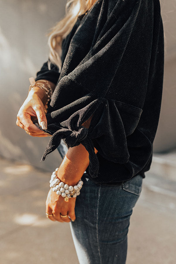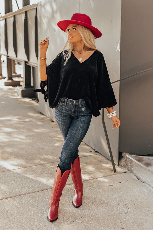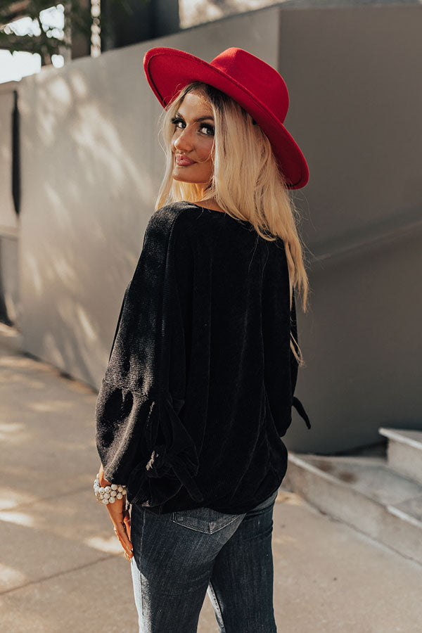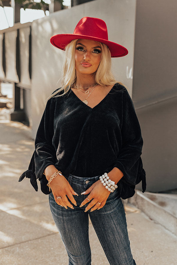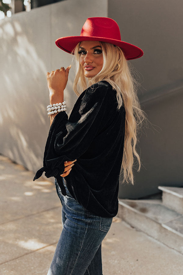 Your coffee run outfit just got an upgrade with our trendy 'Cause To Covet' velvet top! Features a tight knit black colored velvet fabric, v-neckline, three-quarter length dolman sleeves with tie detail, and relaxed silhouette that falls into an uneven hemline.
