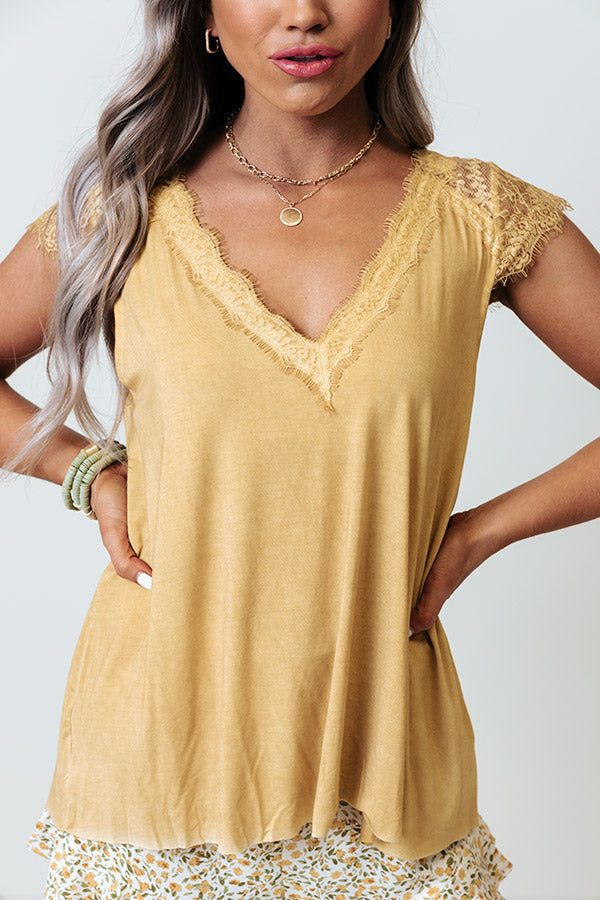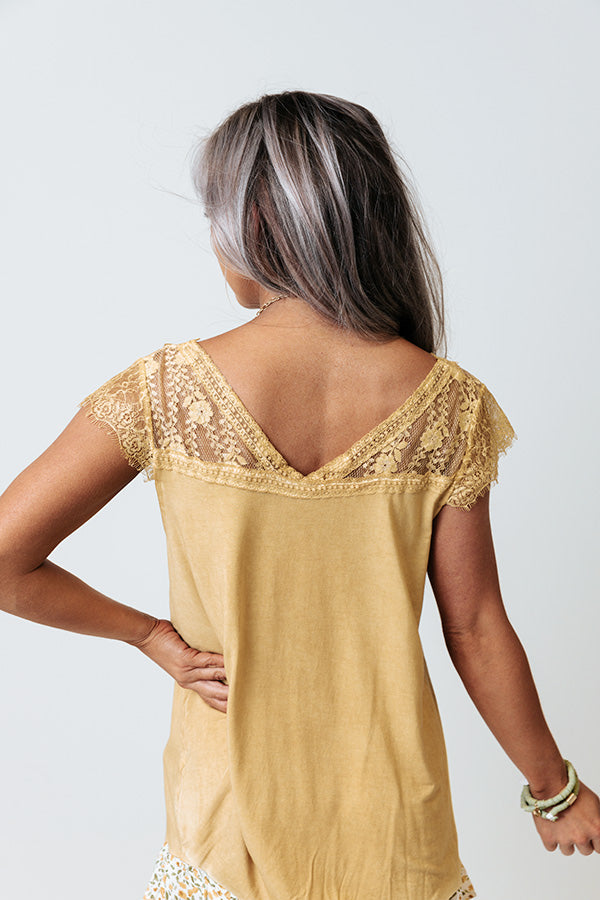 Everyone will surely be crushing on you when you wear this casual cute primrose yellow top featuring soft lightweight material, a v-cut neckline and upper back, intricate semi-sheer lace detailing along the trim and short sleeves, and a relaxed silhouette that falls into a straight hemline with side slits! Measurements