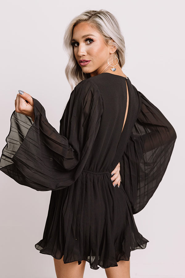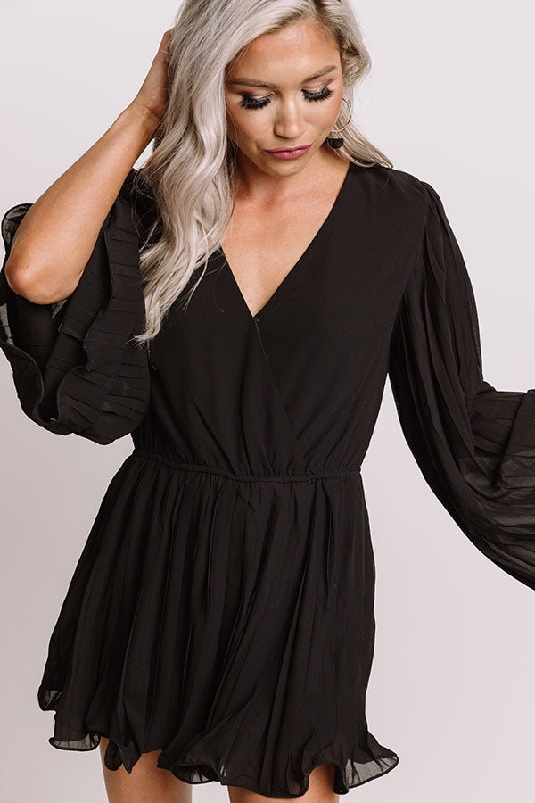 Dress like your a celeb in this stunning black romper featuring lightweight flowy material with pleated detailing, a wrap bodice with a v-cut neckline, long oversized sleeves with flared cuffs, a cinched waistline, an elongated keyhole accented back with a button closures, and a relaxed shorts silhouette that falls into upper-thigh length hemlines with ruffled accent trim!