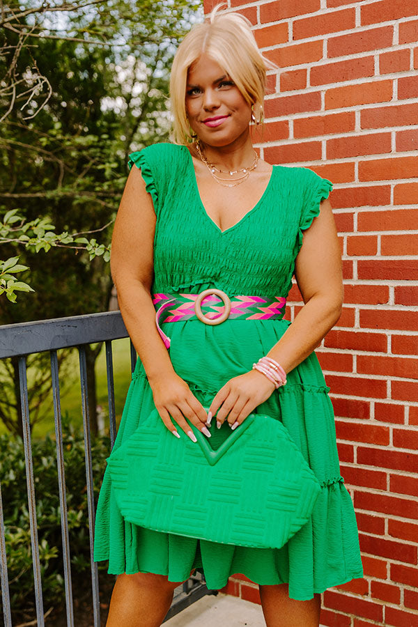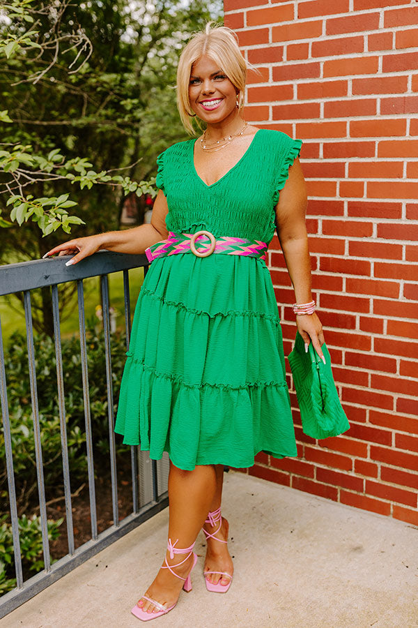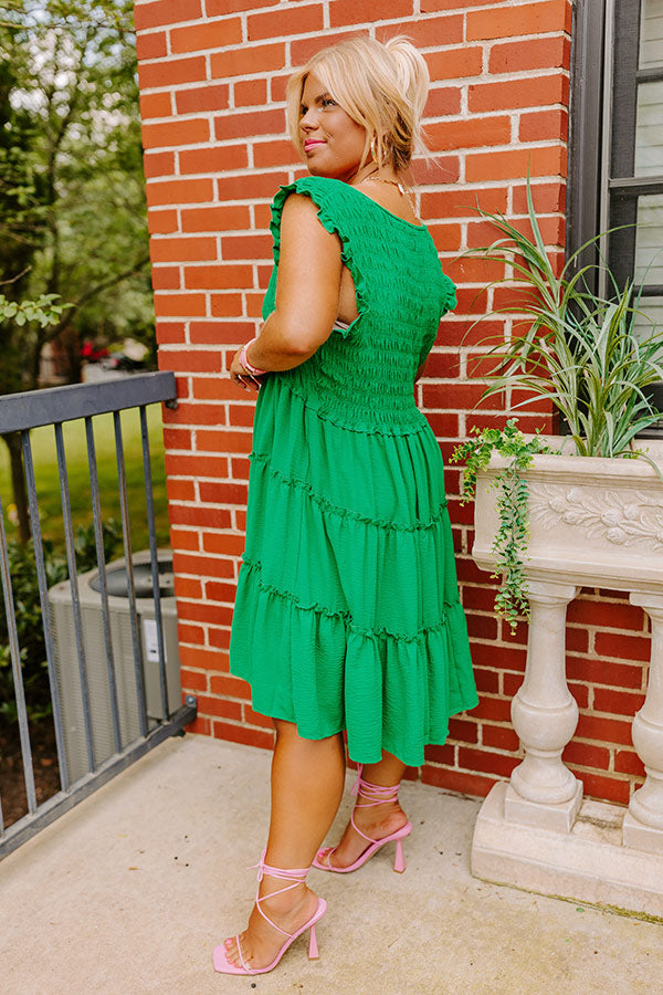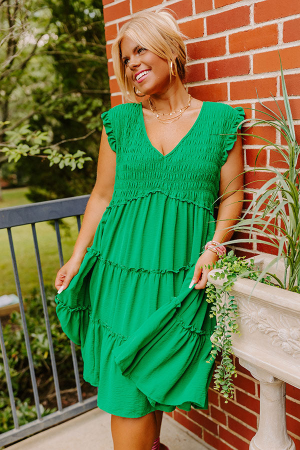 Celebrate summer in style with this beautiful green plus size dress featuring a smocked bodice with a v-cut neckline, subtle ruffled cap sleeves and ruffled accent seams, and a relaxed tiered silhouette that falls into a straight mid-thigh length hemline!