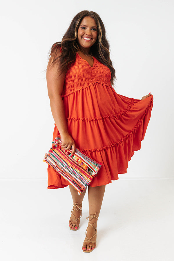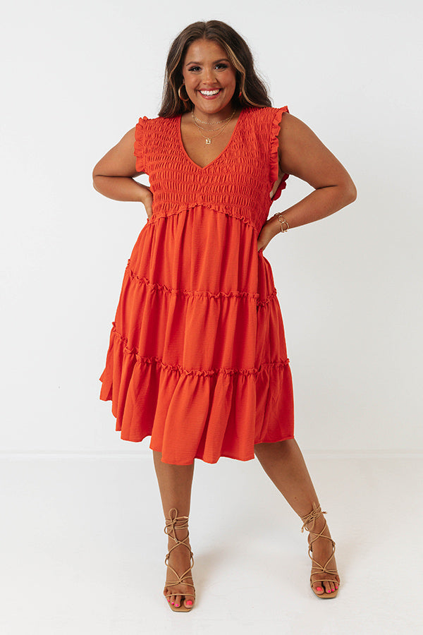 Celebrate summer in style with this beautiful scarlet plus size dress featuring a smocked bodice with a v-cut neckline, subtle ruffled cap sleeves and ruffled accent seams, and a relaxed tiered silhouette that falls into a straight mid-thigh length hemline!