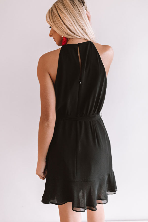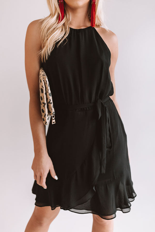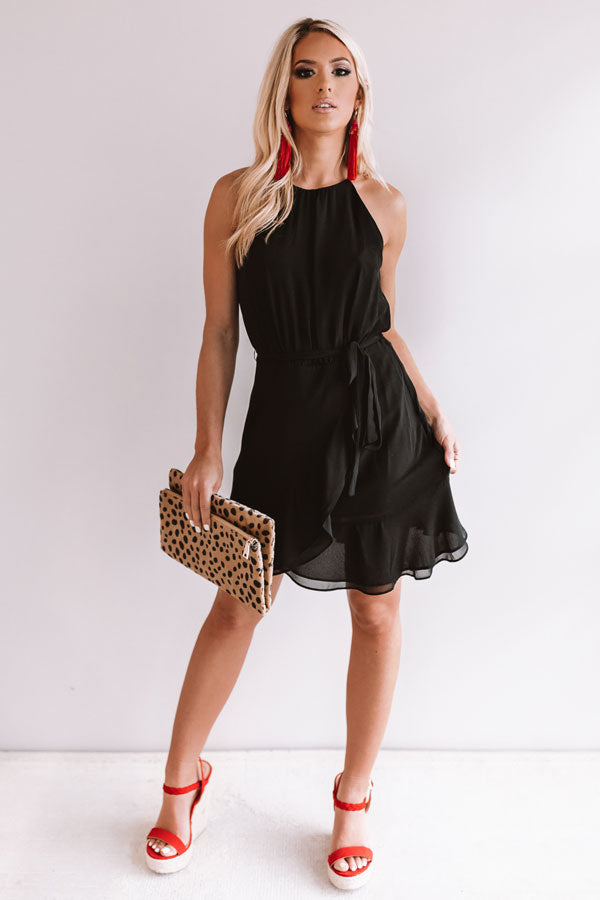 You will be ready for any celebration when you wear this stunning little black dress featuring lightweight material, a high rounded neckline with spaghetti straps, hidden zip back below a keyhole accented upper back with a button closure, a fitted elastic waistline with a tie belt, and a wrap skirt that falls into an uneven mid-thigh tulip hemline with ruffled trim detailing! We have styled this elegant piece with a cheetah print clutch and a red wedge and statement earring, but you can also wear it with "The Carolina Heel in Gold" and our "Pretty And Poised Rhinestone Hair Clip Set in Champagne!"