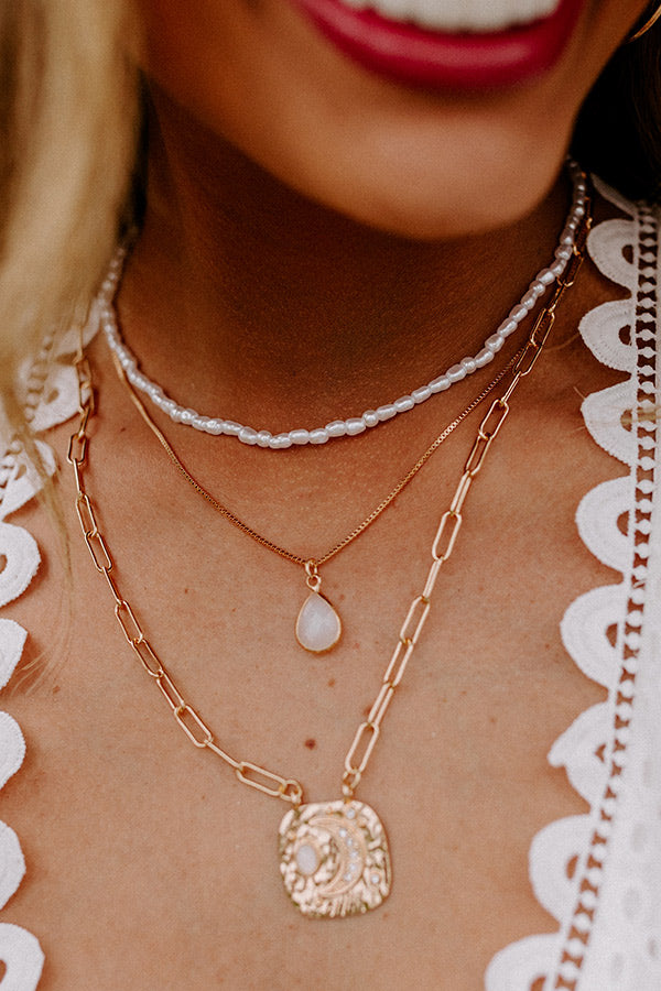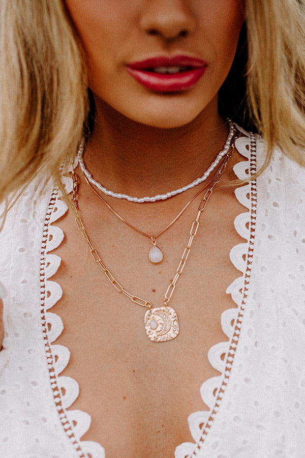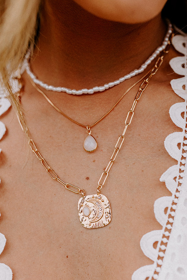 - A necklace with two different gold chains featuring a rhinestone embellished moon pendant and a dangling white teardrop rhinestone