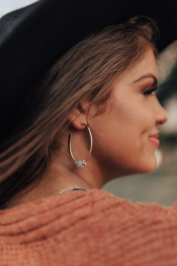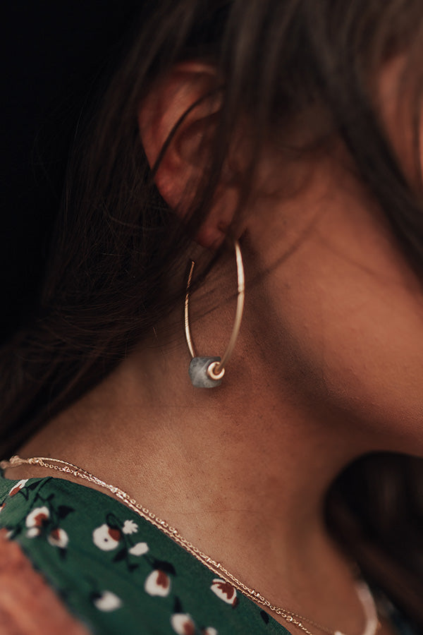 Your style will be out of this world when you accessorize with our stunning 'Celestial Gaze' statement earrings featuring solid gold hoops with grey semi precious stone accents!