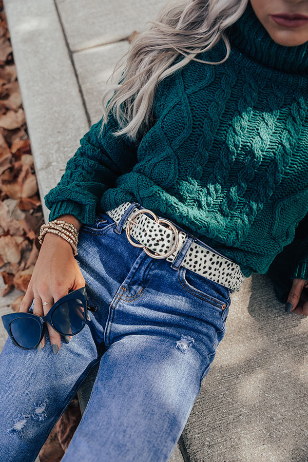 You are sure to be the "center of attention" when you accessorize with this ivory colored faux leather belt featuring a wide black leopard print band and a two gold circle buckle!