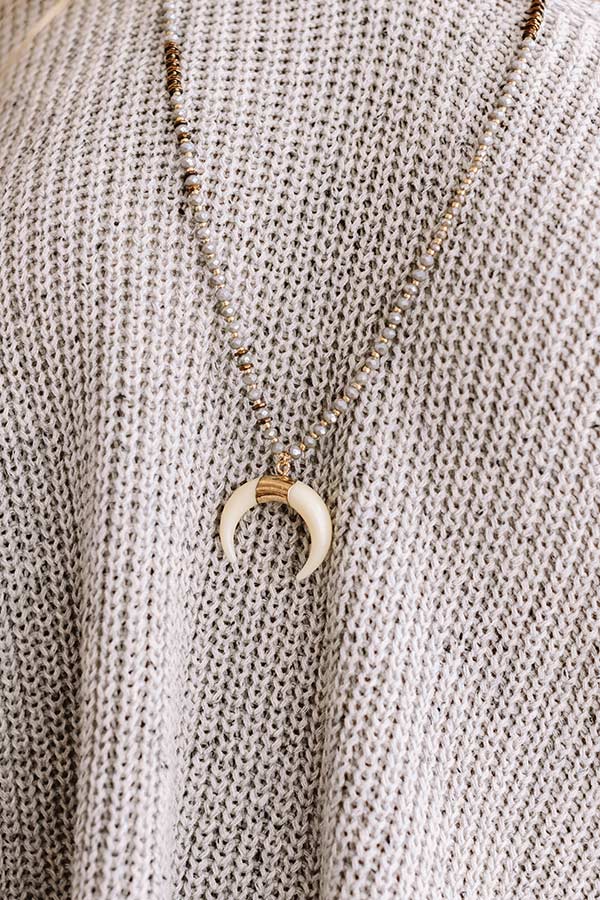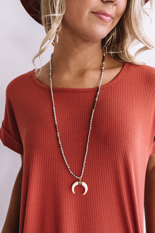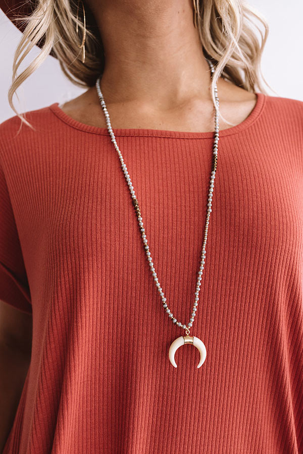 You will give them all something to talk about when you accessorize with the dainty "Center Of The Universe" necklace featuring a long grey and bronze beaded chain with a crescent moon charm!