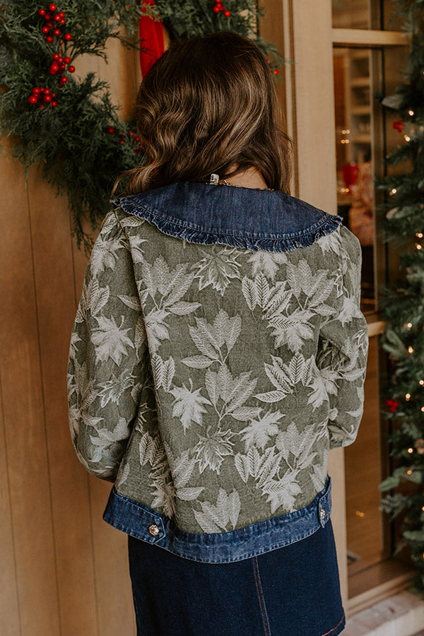 - Bring sweet, playful vibes to your look with this darling denim jacket! Its charming botanical design and ruffled collar add the perfect trendy twist to your everyday style.